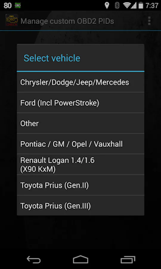 7) Usually this screen will not display any entries, unless you have added any pre-defined or custom PIDs in the past.