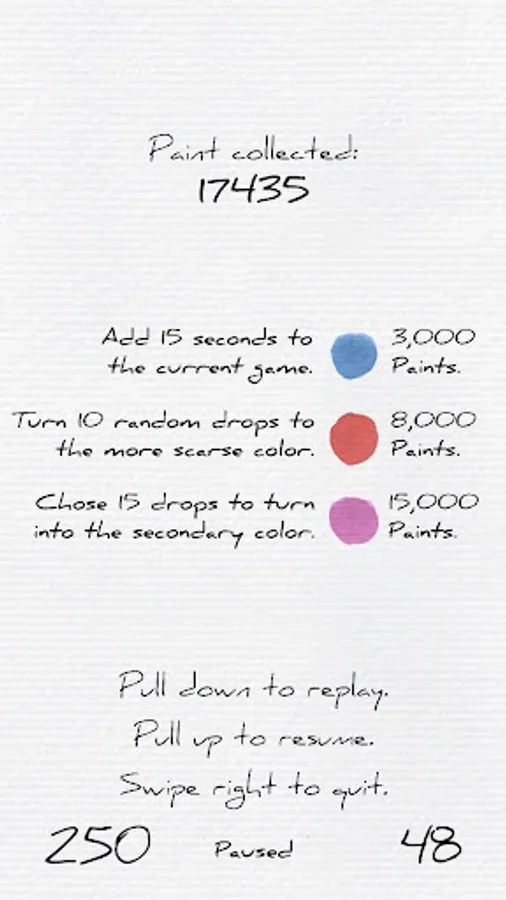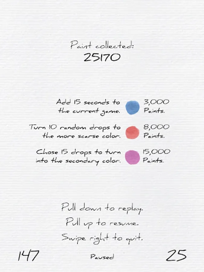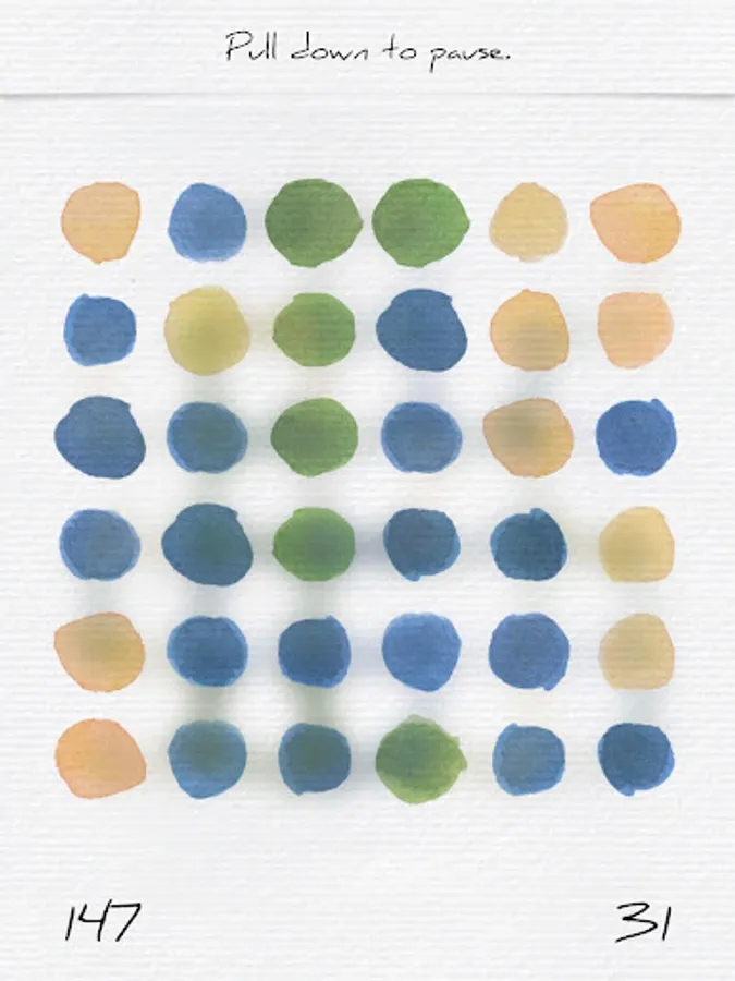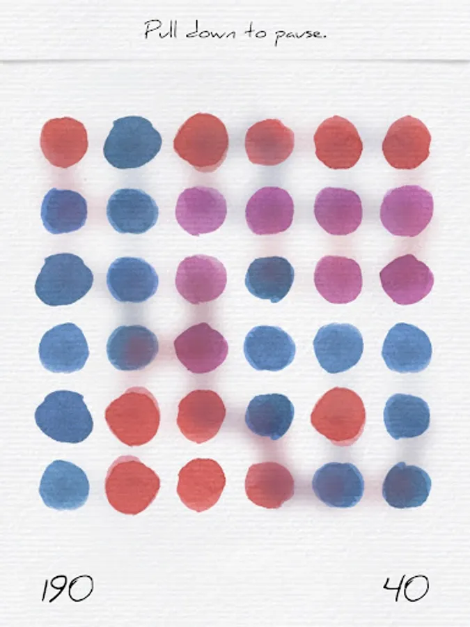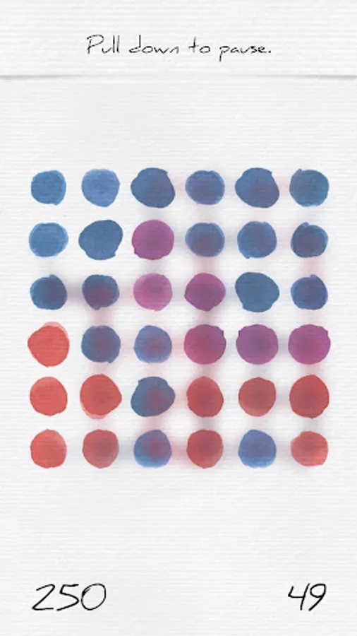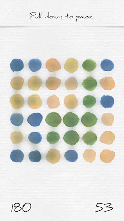 On Pigments, you mix drops of primary colors, trying to create a long streak of a secondary color, earning points by removing the mixed color. You start the game with 60 seconds left, but depending on the amount of drops you remove, you may also earn more time.