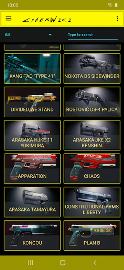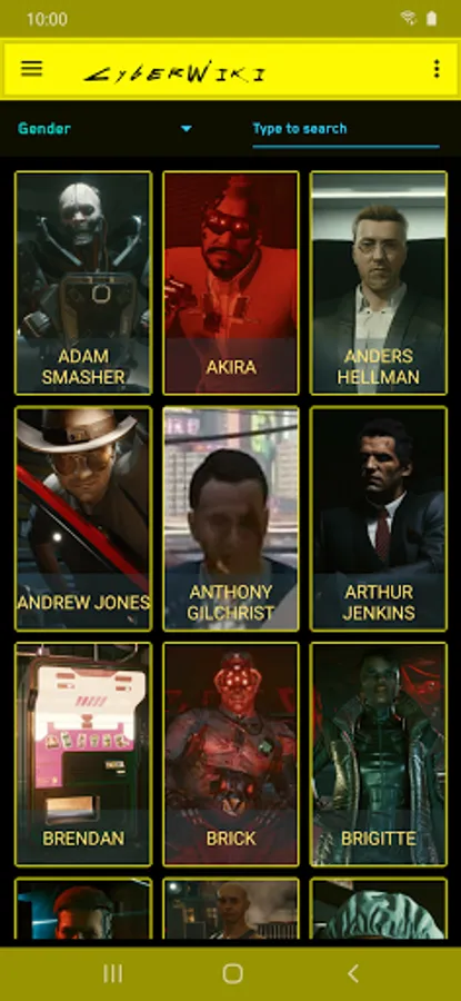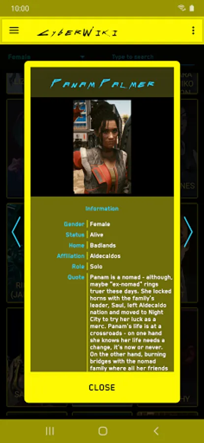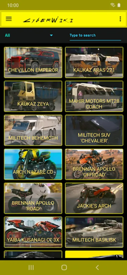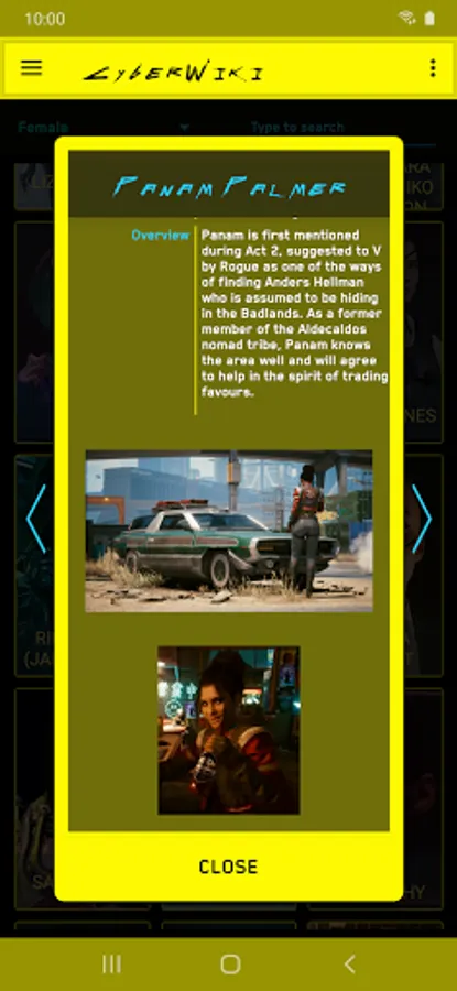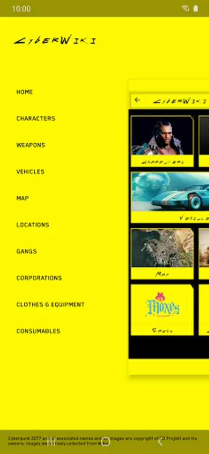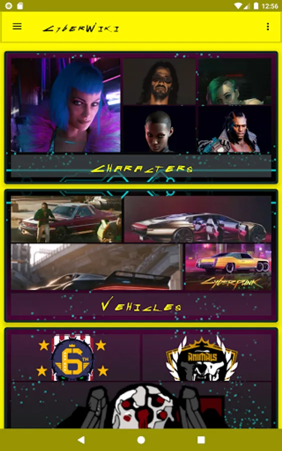This fan app allow you to view the characters, vehicles, gangs, locations and other informations from Cyberpunk 2077. (More information and data from the game to be added )