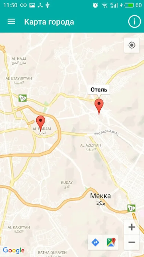 This page makes it easier and faster to orient Xia in a strange city, if you get lost, forgotten which side the mosque or where your hotel. On the city map shows the location of the al-Haram in Mecca and Nabawi in Medina, as well as the location of your hotel. Turn on your smartphone geolocation function and, in the presence of a stable mobile phone, you will be able to see in the online mode, your location on the map at any given time, as well as to build a route of movement.