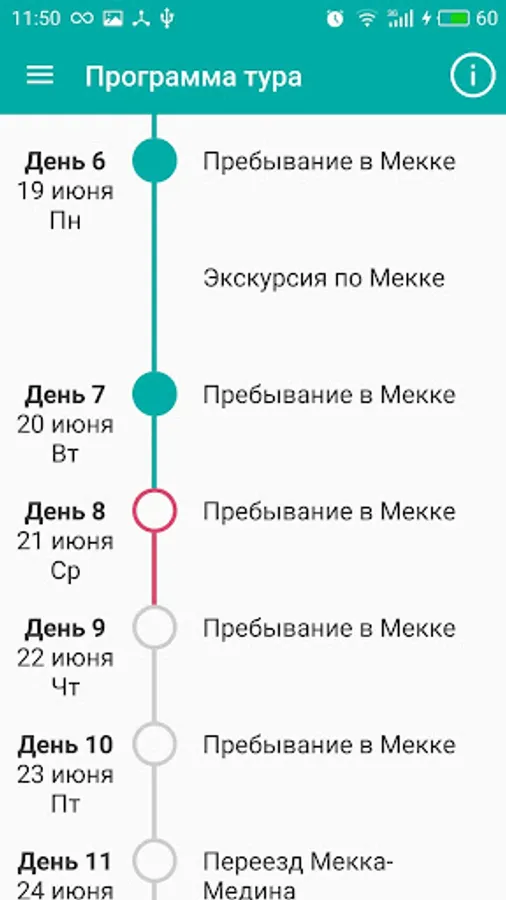 by days. Specified days in the cities of Mecca and Medina, the days of crossings / flight on which days - excursions, etc.