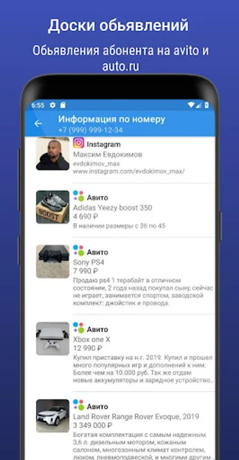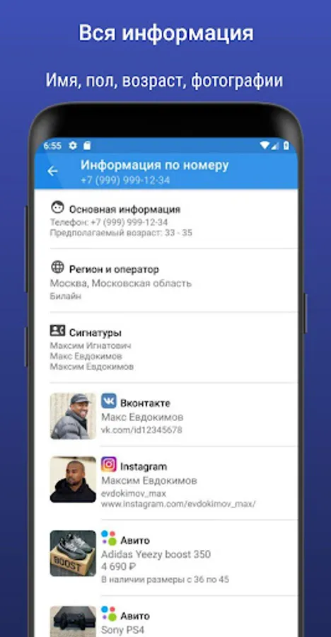 Using the Information by number application, you can find out whose phone number is calling and who it belongs to, find the name, age, geolocation, Vkontakte, Instagram, Facebook, Avito, Auto.ru pages by phone number and understand where the call is from, who is calling from an unfamiliar phone number and from where, without lifting the phone.
