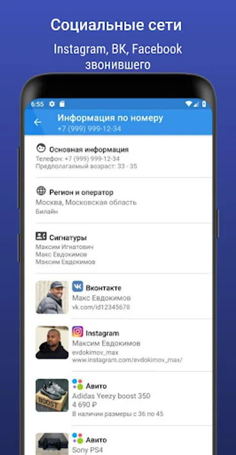 With the help of the application, you can find out whose phone number is calling and who it belongs to, breaking through numbers, age, social. networks, goods and understand where the call came from, who called from an unknown phone number and from where without picking up the phone.
