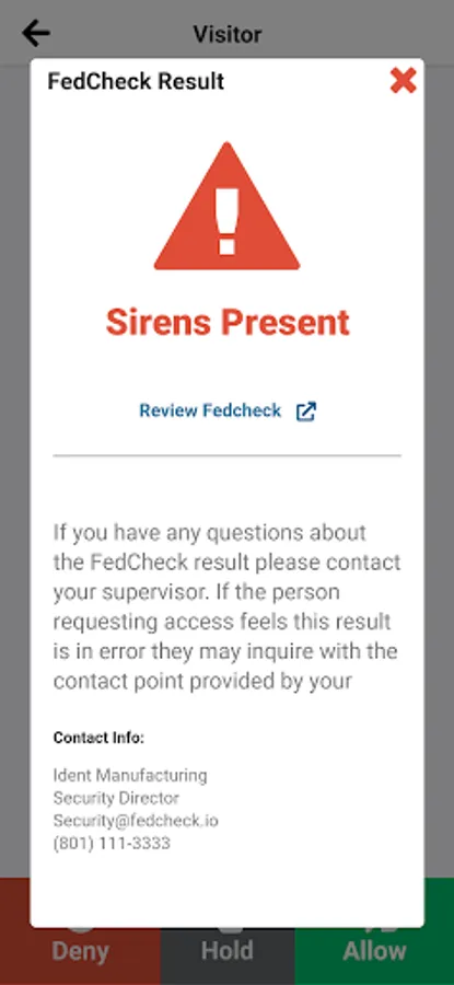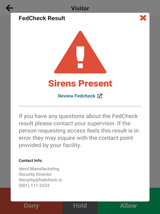 FedCheck is an instant threat detection solution that notifies the user in real-time if a visitor is a potential threat – before they are admitted into a facility. FedCheck works by scanning a government issued ID, such as a driver license. Within seconds FedCheck gathers, scrubs, and organizes all that data into customizable alerts, immediately sharing results with your security team members instantly and voicelessly.