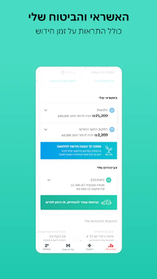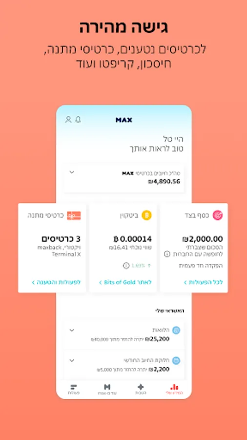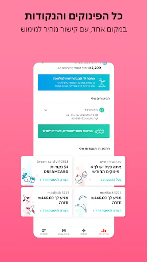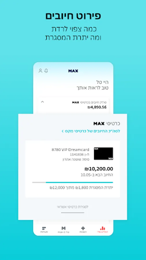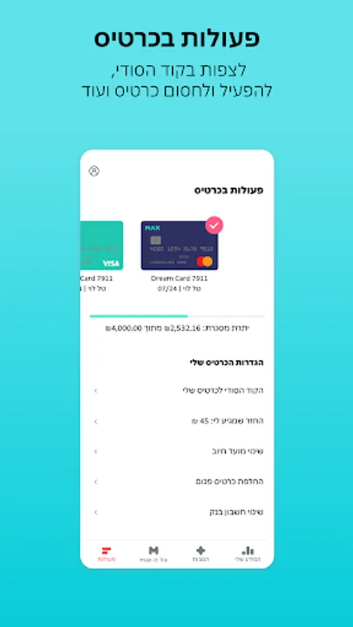- Operations on the card - history tells us that people used to call the service hotline to report that the card was lost or stolen, request that they transfer a frame from one card to the other, change the billing date and send standing orders. How fun that we are no longer there and today you can perform all these actions and more 24/7 by remote control through our app. So if you want to view the card's secret code, block the possibility of making phone or internet transactions in Israel or abroad, convert your maxback points, check the balance of the frame or make a payment in advance, go to the operations tab, everything is waiting for you there.