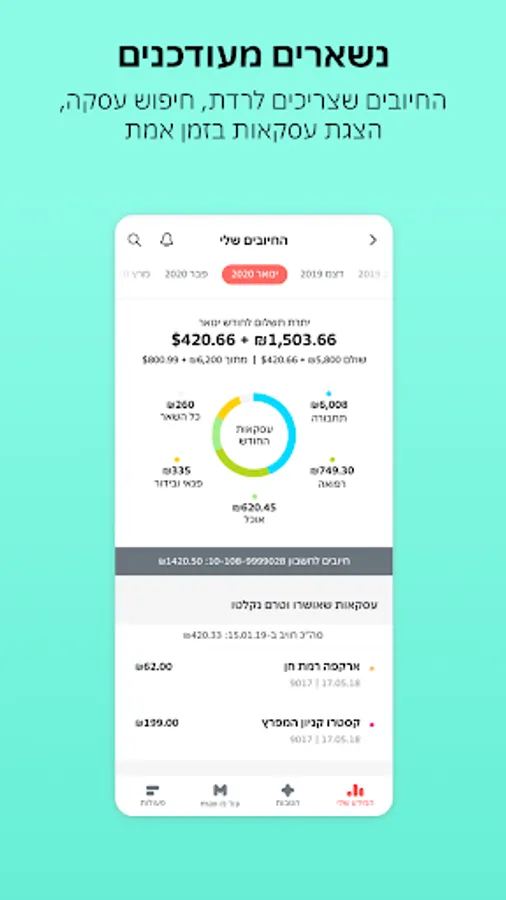 - The charges that need to go down - apart from what you already know, you can see the next charge for all cards together or for each card separately, search for a specific transaction that you lost, share transaction details and even see transactions you just made a minute or two ago (confirmations). You can also tag each transaction and give it a meaningful name for you so that when you return to it you will immediately understand what it is about, divide into payments the total monthly charge or the amount of the specific transaction even after it has been carried out and see receipts from businesses that support the service.
