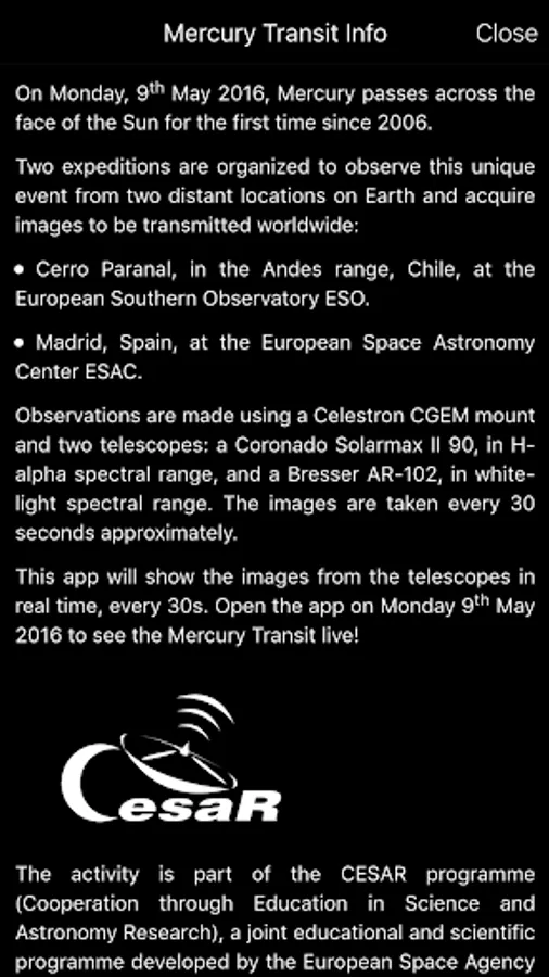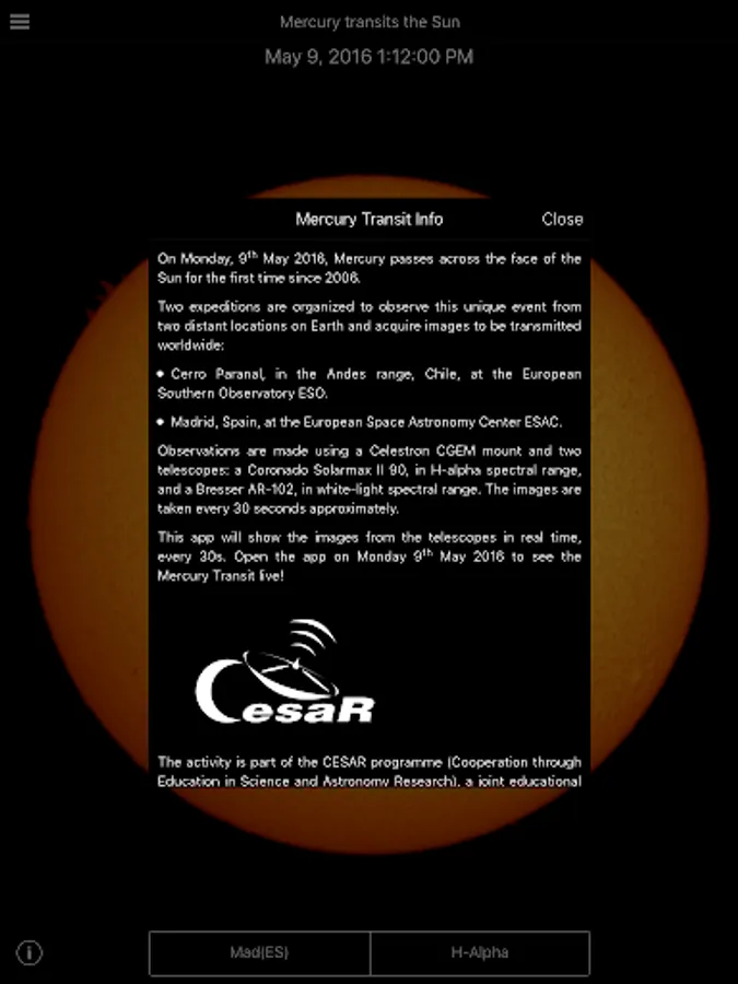 The activity is part of the CESAR programme (Cooperation through Education in Science and Astronomy Research), a joint educational and scientific programme developed by the European Space Agency (ESA), the Spanish National Institute for Aerospace Technology (INTA) and the company ISDEFE, conceived as a link between astronomy research and the education community.