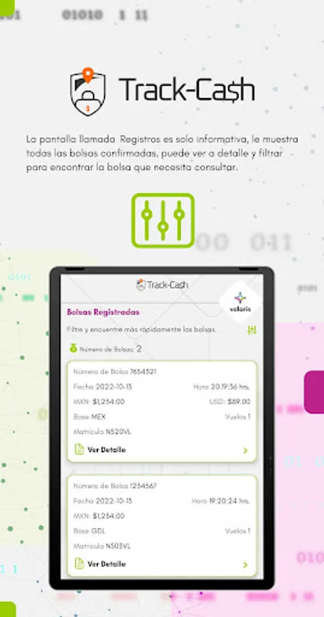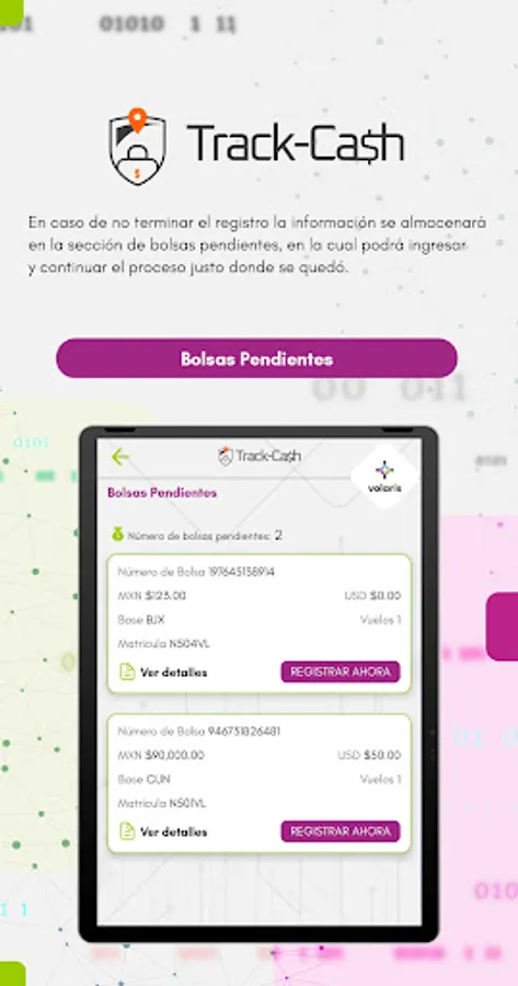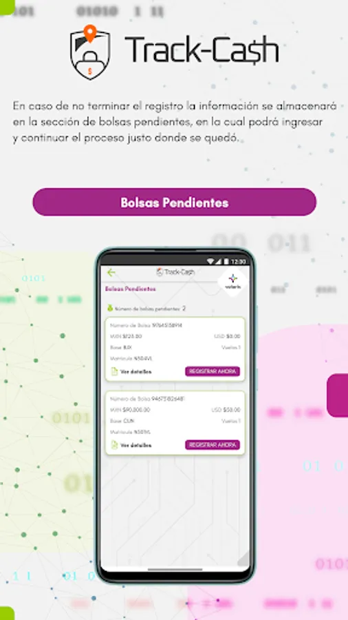 Track Cash is a mobile application developed for the management and control of bags used on flights, which allows you to register bags and keep them pending or check information after registration, such as: