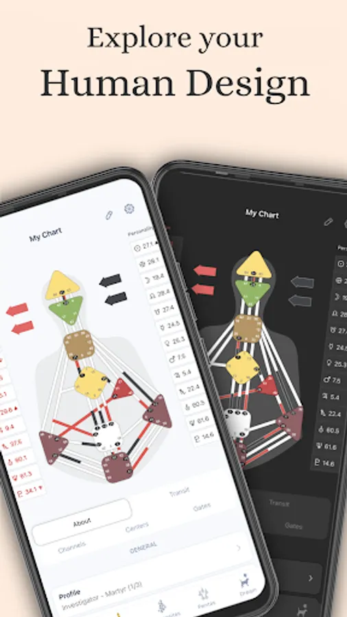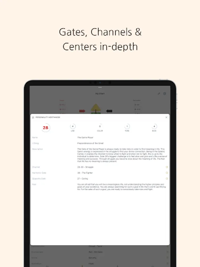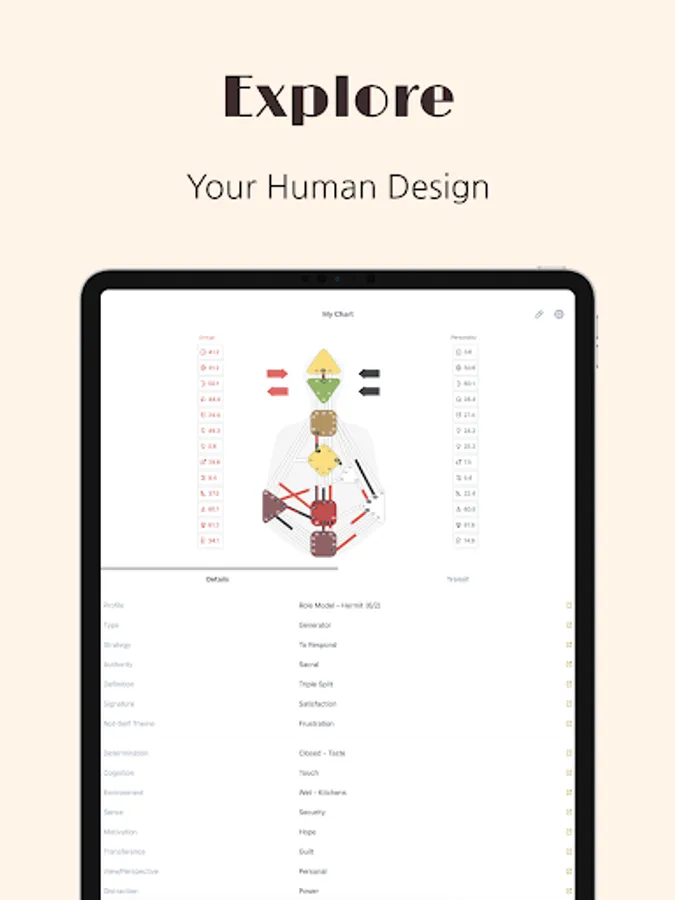 Explore your Human Design in depth! Neutrino Design provides detailed descriptions to many characteristics derived from ancient knowledge like I-Ching, Kabbalah, Chakras, advanced Astrology, Numerology and more. Gain access to: