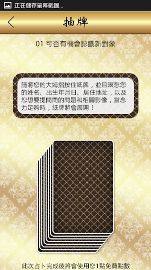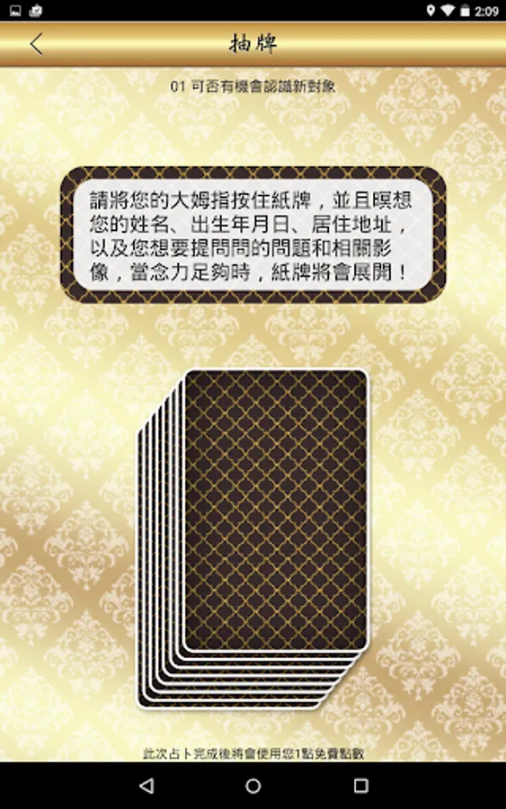 2.請將您的大拇指按住紙牌,並且冥想您的姓名、出生年月日、居住地址,以及您想要【提問的問題和相關於問題情境作冥想】,當念力足夠時,紙牌將會展開!