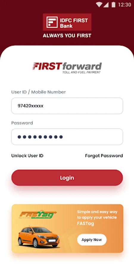 * Logging in via their IDFC FIRST Bank FIRSTforward FASTag user id and password