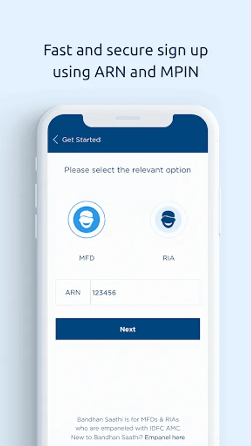 • Fast and secure sign up using ARN/RIA code and MPIN