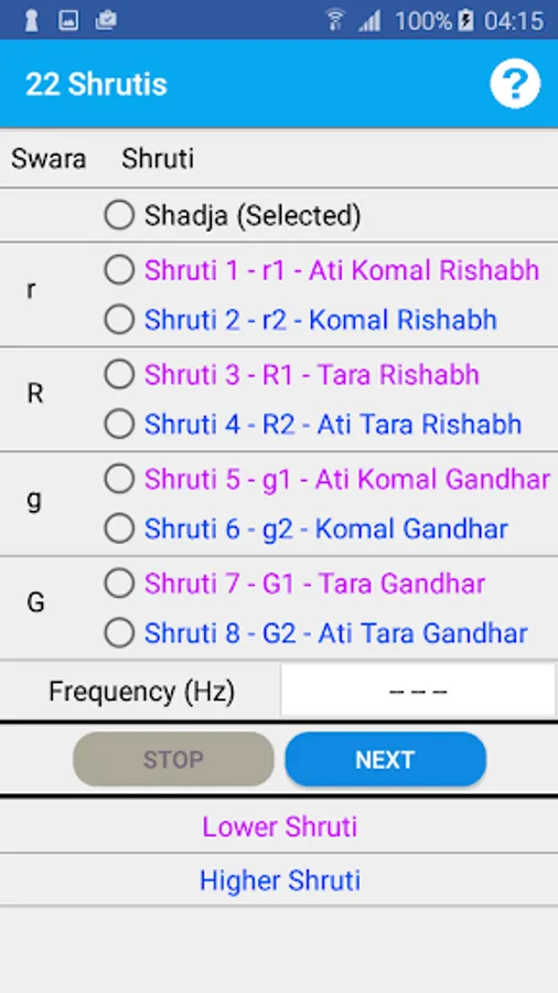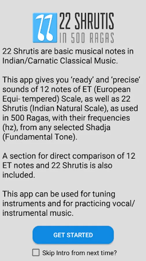 22 Shrutis are basic musical notes in Indian/Carnatic Classical Music. This app gives you ‘ready’ and ‘precise’ sounds of 12 notes of ET (European Equi-tempered) Scale, as well as 22 Shrutis (Indian Natural Scale), as used in 500 Ragas, with their frequencies (hz), from any selected Shadja (Fundamental Tone). A section for direct comparison of 12 ET notes and 22 Shrutis is also included. This app can be used for tuning instruments and for practicing vocal/instrumental music.