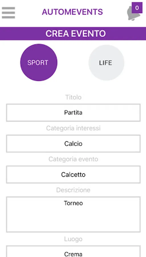 The Sport section (in which it is possible for example to organize the soccer game on Monday!) Is set by default for events with a defined number of players "owners" to whom you can add in advance any "reserves", while the Life section it is oriented towards the organization, advertising and promotion of events in general.