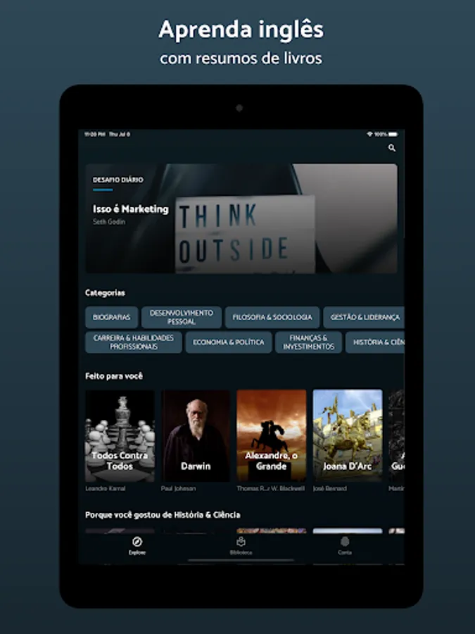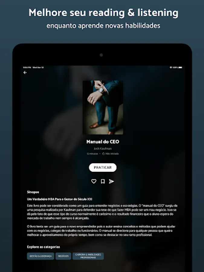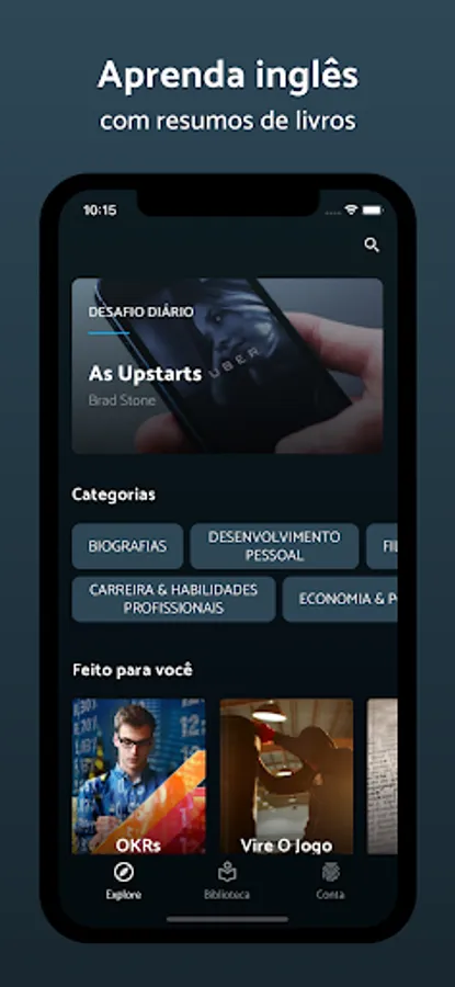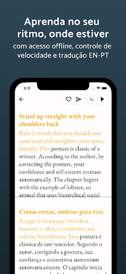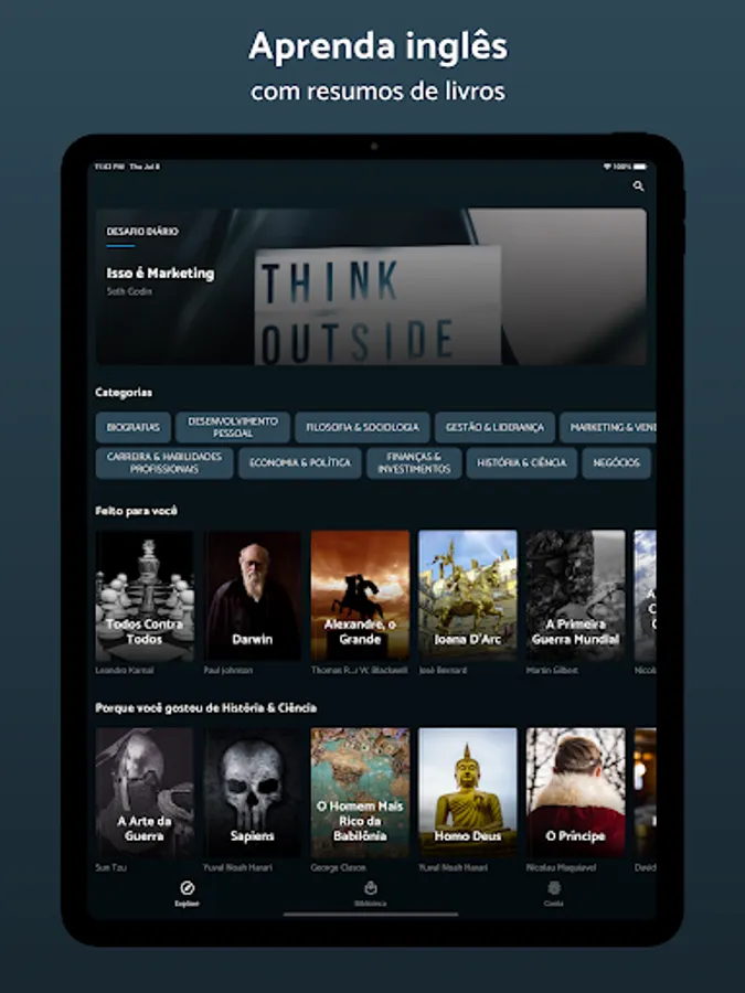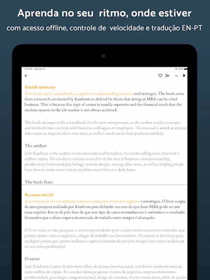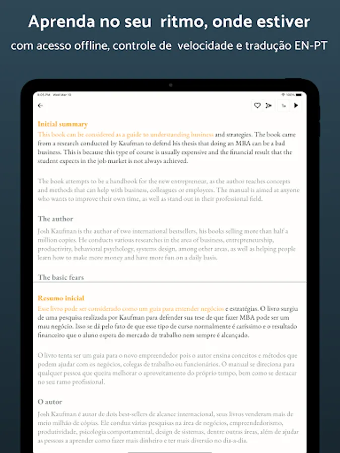 In the Idiomus app you will have access to hundreds of non-fiction books summarized in text and audio in bilingual format (English with synchronized translation)