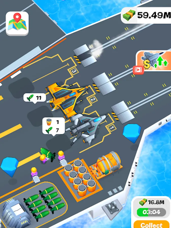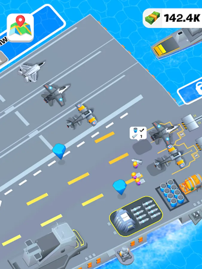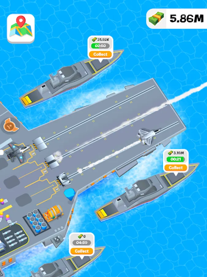 Buy the first runway and the first plane for your aircraft carrier. Let the plane perform the task. Completing the task can provide you with a renovation point. Continuously expand your aircraft carrier with the transformation point until he becomes the biggest one.