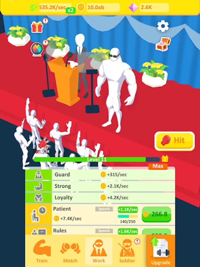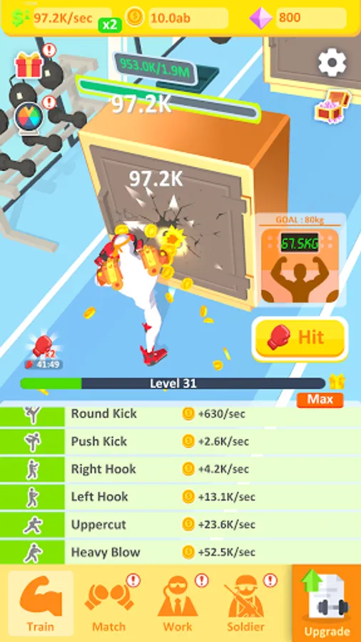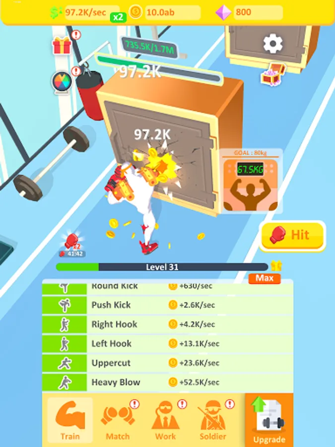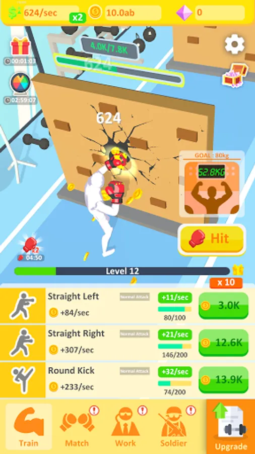 No excuse to be idle! Level up and fill those progress bars in this boxing simulator game to advance to the next day with punching, smashing the wall, equipment training, and more. Try on a new boxer in this boxing simulator!