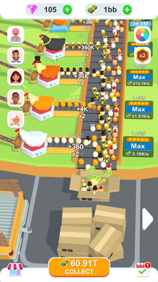 Starting from a small factory, the eggs will be packaged and sold to earn income. Use the money to upgrade the production line. The higher the level, the faster the production speed and the higher the price. Unlock new production lines to obtain different types of eggs.