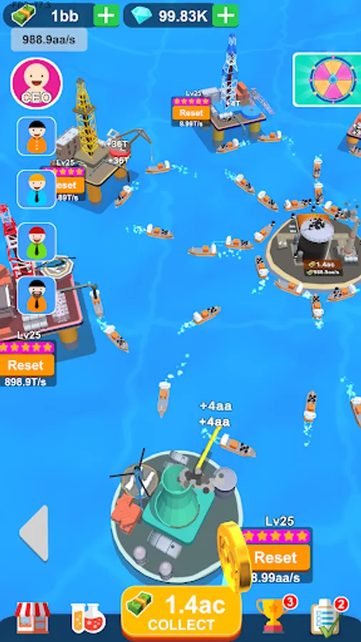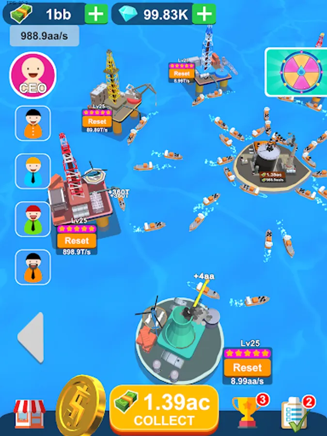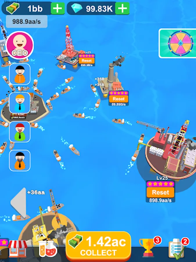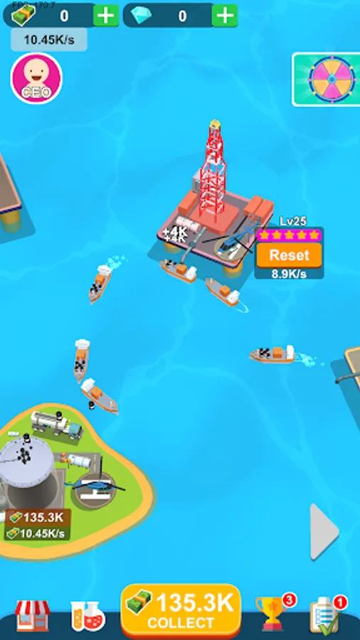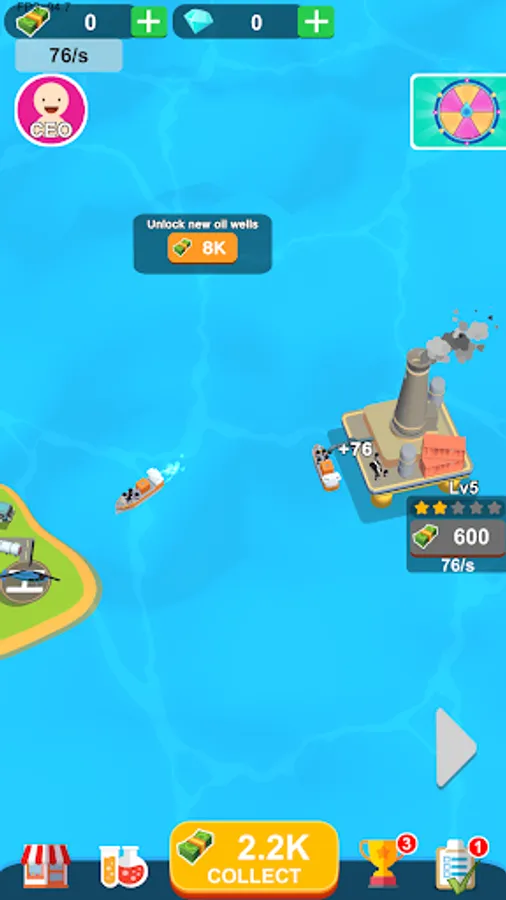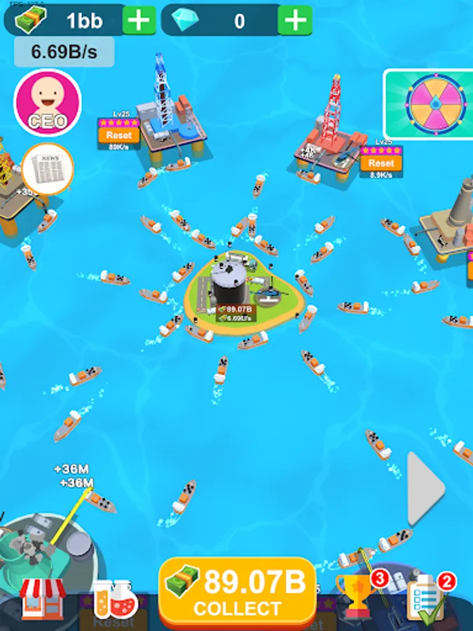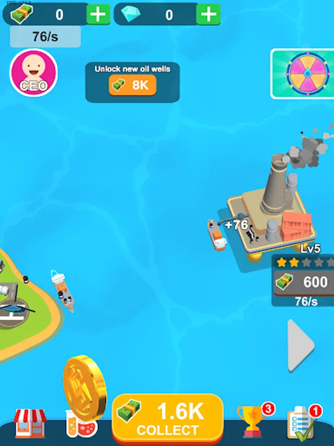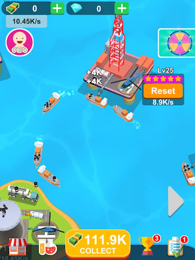 Starting from the first collecting equipment, we kept mining oil from the oil field at sea, and then transported them back to land with a transport ship. Constantly cumulative income, upgrade and mining equipment with income, build new oil mining points. Buy more cruise ships to transport oil. Continue to expand your business until it becomes the largest one in the world.
