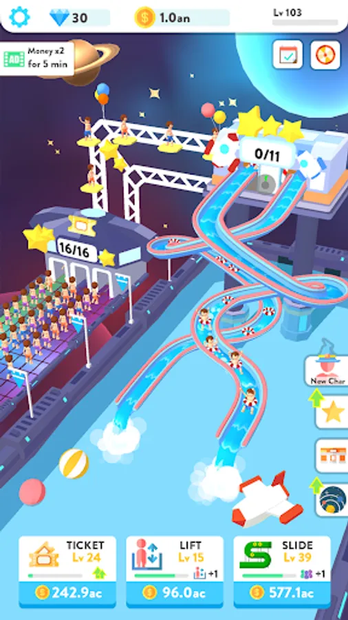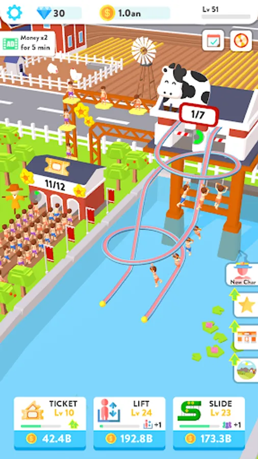 Start with a small water park and expand it into a large water park. Add queuing entrances to speed up the flow of people and provide quality services and experiences. Open more elevators and slides. Let customers play freely!