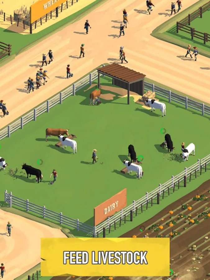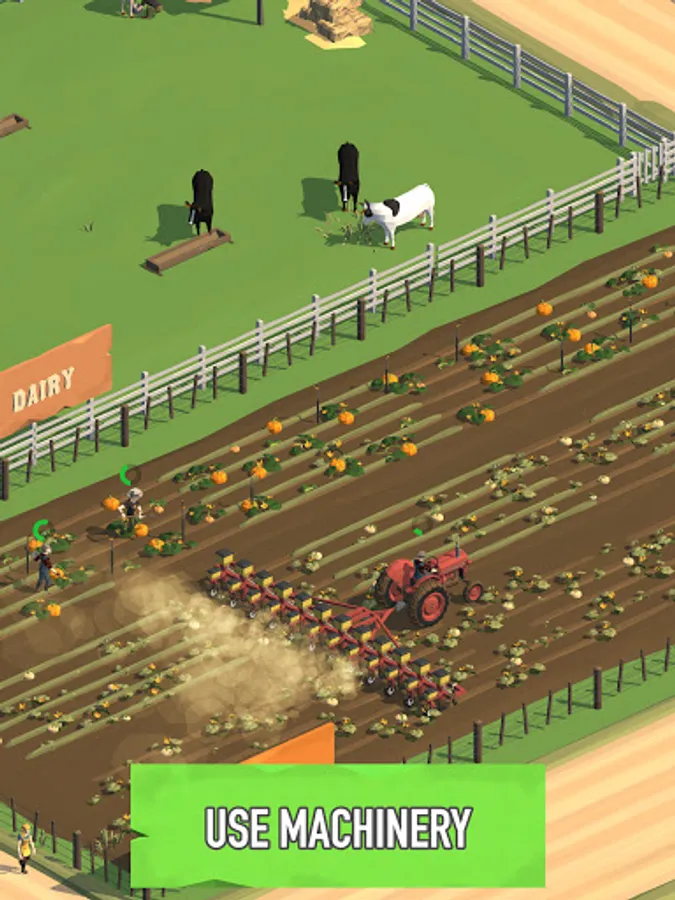 Can you run your Farm better than everyone else? This is your day, become the wealthiest farmer in the world. There is a lot of work to be done in the countryside, guide your farmers and become a countryside tycoon. Unlock different areas of the farm: peppers field, dairy area, sunflowers field, salad hotbed, wheat field, hayfield, apple trees, watermelons field, fish pond, carrots field, peaches, and much more. After your farmer finished all the work, he is attending the market to sold farm crops. The more villagers and areas you have unlocked, the richer you are. Get gems for achievements and use them to improve your game progress drastically.