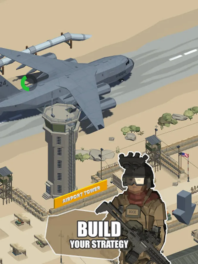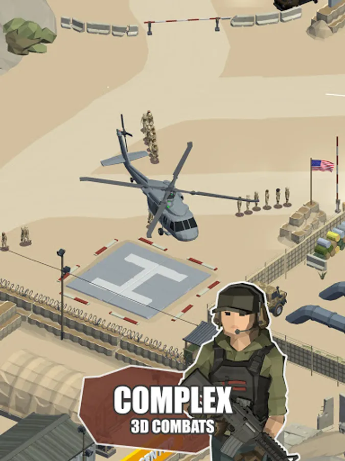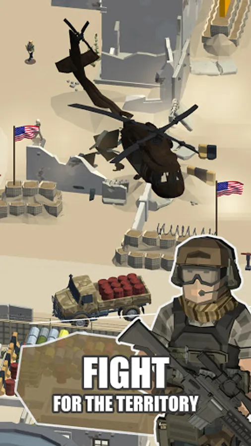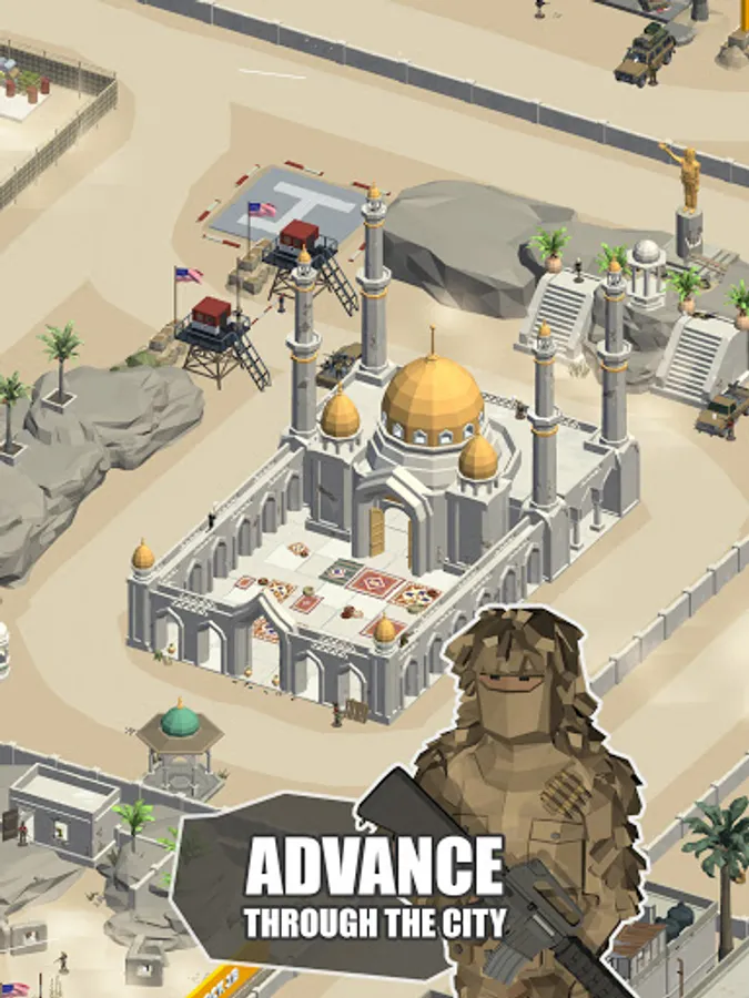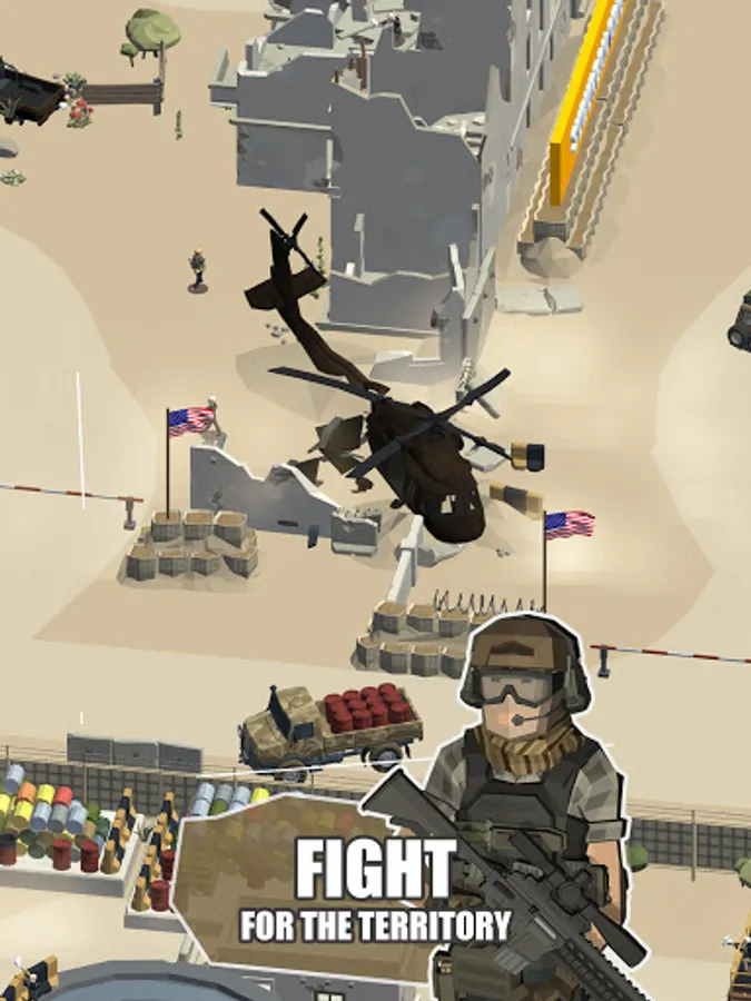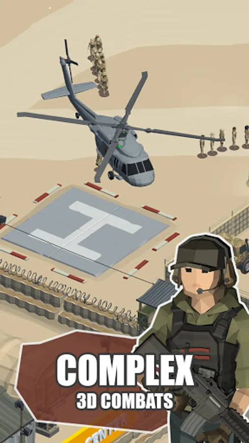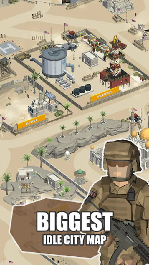 How is our game different from all other Idle games? Our game is most complex out there, with a lot of 3d interactive fighting combat situations. Realistic 3d animations and interactions between soldiers make you feel like on a real battlefield. You have more than 16 areas to unlock throughout the game, with a great variety of weapons, tanks, cars, airplanes, and helicopters.