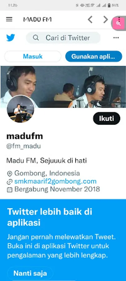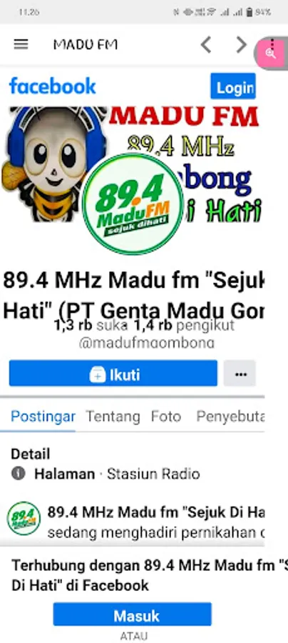Madu FM is a radio in the form of a private broadcasting institution located in the western part of Kebumen district, with religious and cultural education content, officially licensed since early 2019. Studio in the Maarif 2 Vocational School complex, Jl. Cucumber No. 96 B, Gombong, Kebumen, Central Java. The beam's position on the hills of Pesona Kayangan Karang Gayam, Kebumen, makes the beam broad, although relatively moderate in power, covering the districts of Kebumen, Cilacap, Banyumas, Purbalingga, Banjarnegara, Wonosobo and Purworejo. It is in great demand by listeners because it presents good music and excellent audio quality, in addition to program packages that are applicable according to taste, from the children's, youth, adult and elderly segments. "Sejuk Di Hati" provides the dominant color for the presentation of the program, making listeners feel at home and reluctant to switch to other channels.