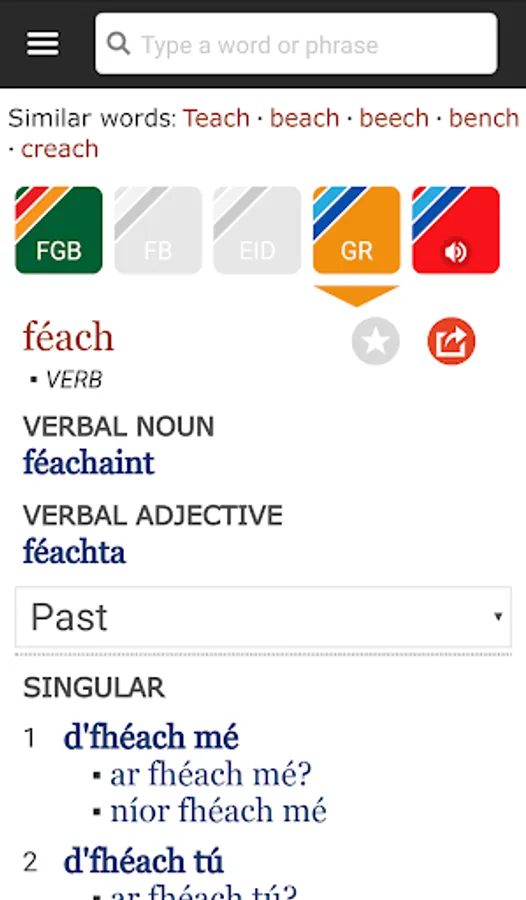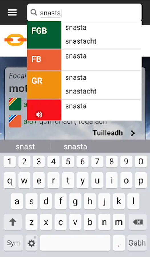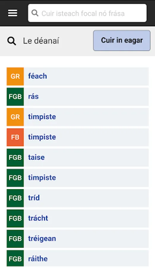 • Uathchríochnú sa chuardach chun cabhrú leat focail agus frásaí a aimsiú go tapa;