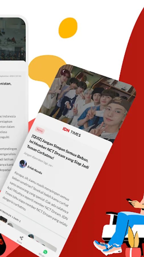Dengan fitur personalisasi news feed, jangan sampai tertinggal berita-berita terbaru sampai trending. IDN menyediakan fitur sharing ke sosial media agar kamu bisa membagikan artikel favoritmu kepada teman-temanmu!