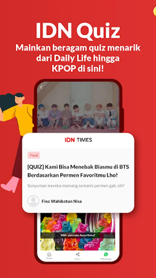 Fitur ini menyediakan berbagai quiz menarik yang bisa kamu mainkan, lho! Mulai dari quiz seputar daily life sampai topik seputar KPOP seperti member BTS, NCT, BLACKPINK dan lainnya juga bisa kamu cari dan mainkan di fitur IDN Quiz.
