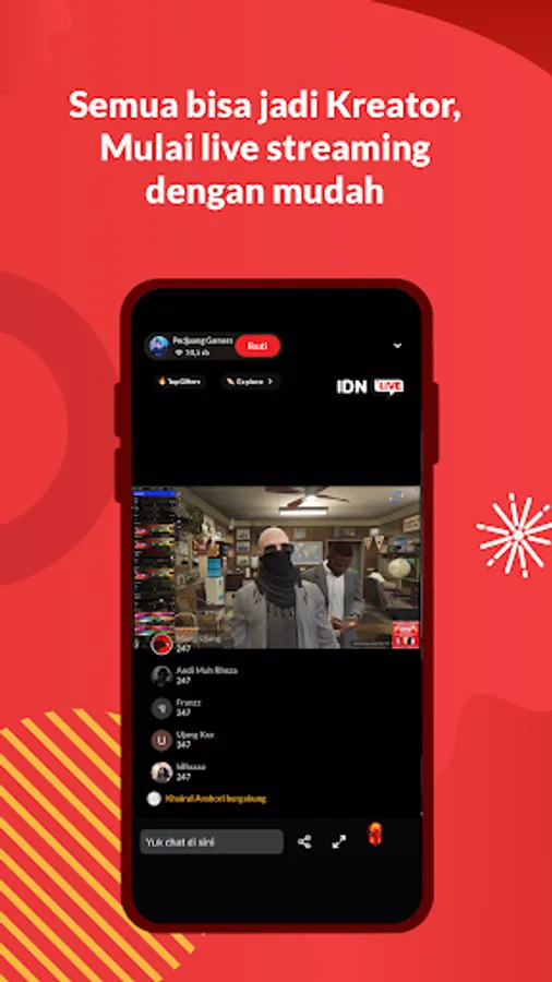 Bukan cuma jadi penonton, kamu juga bisa buka live room dan jadi live streamer! Caranya gampang banget. Cukup dengan mengirimkan virtual gift golden ticket ke salah satu streamer yang sedang live dan team IDN akan mengkurasi untuk memberikan akses sebagai live streamer dalam 1x24 jam.