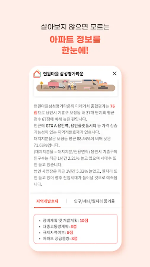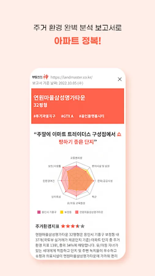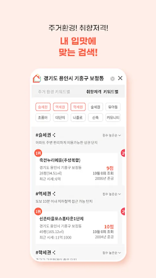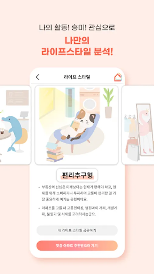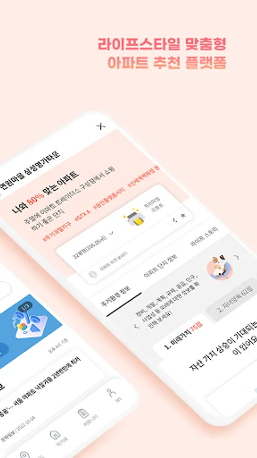 More than 12 million pieces of data such as regional convenience, indoor environment, complex environment, market price, transaction details, and market price increase rate are collected in real time to match apartments optimized for lifestyle.
