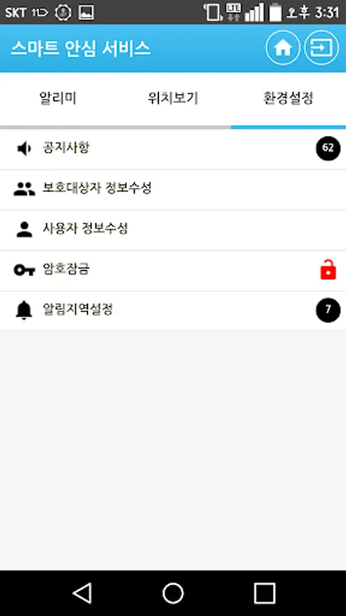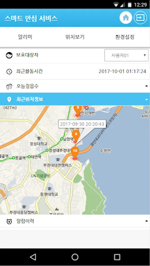 스마트 안심알리미 앱은 각 지자체 부산광역시, 김해시, 양산시, 울주군에 설치된 로라(LoRa) 사설망을 이용하여 어린이, 치매노인, 지체 장애인 등의 사회적약자의 실종, 사고 등 긴급 상황이 발생할 경우 지급된 휴대용 로라 태그의 알람신호를 받아 보호자에게 앱으로 긴급알림을 제공 합니다. 태그의 GPS 신호를 이용하여 위치 정보를 실시간으로 확인할 수 있으며 긴급상황에 대한 대응을 신속하게 할 수 있는 서비스 입니다.
