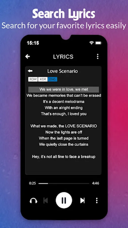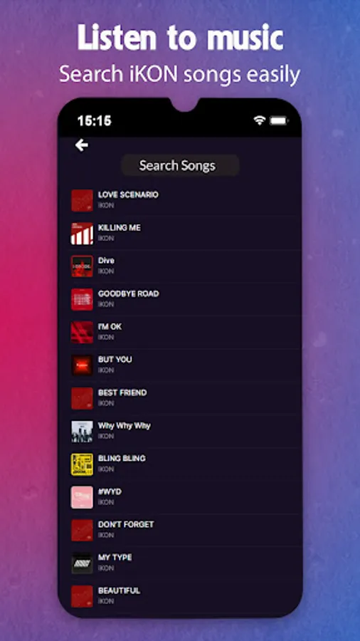 IKON Lyrics is an application that integrates the lyrics of iKON's hot hit songs in Romanization, Korean, and English. The lyrics viewer is completely offline. Turn on your favorite songs, see the lyrics, and sing along with ease. Who knows, maybe you will learn another new language. Its interesting, isnt it?