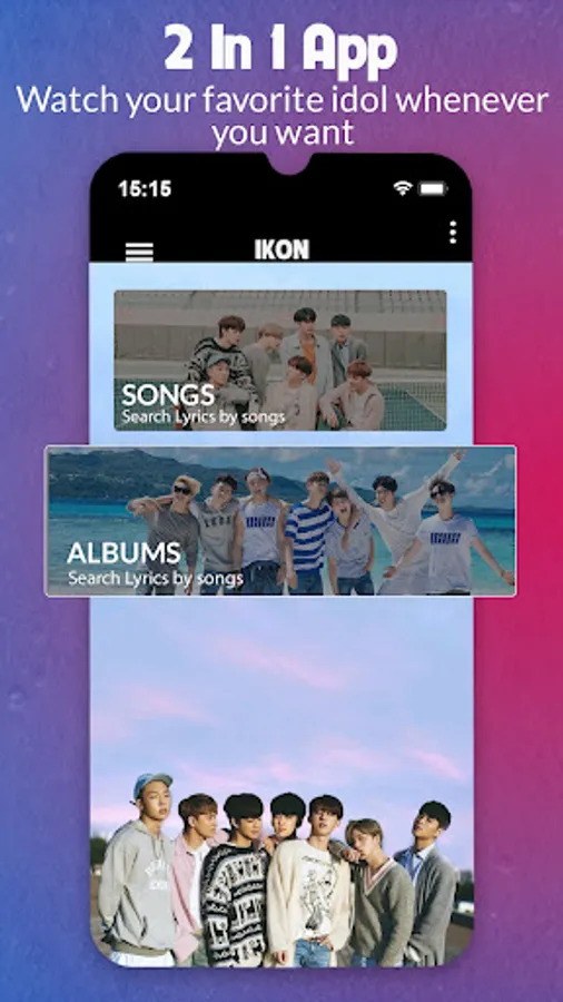 Download the only IKON Lyrics application to own a unique 2-in-1 entertainment application, attractive in every detail, to relax and watch iKON's boys delight at any time you would like. So what are you waiting for without downloading and experiencing it right away?