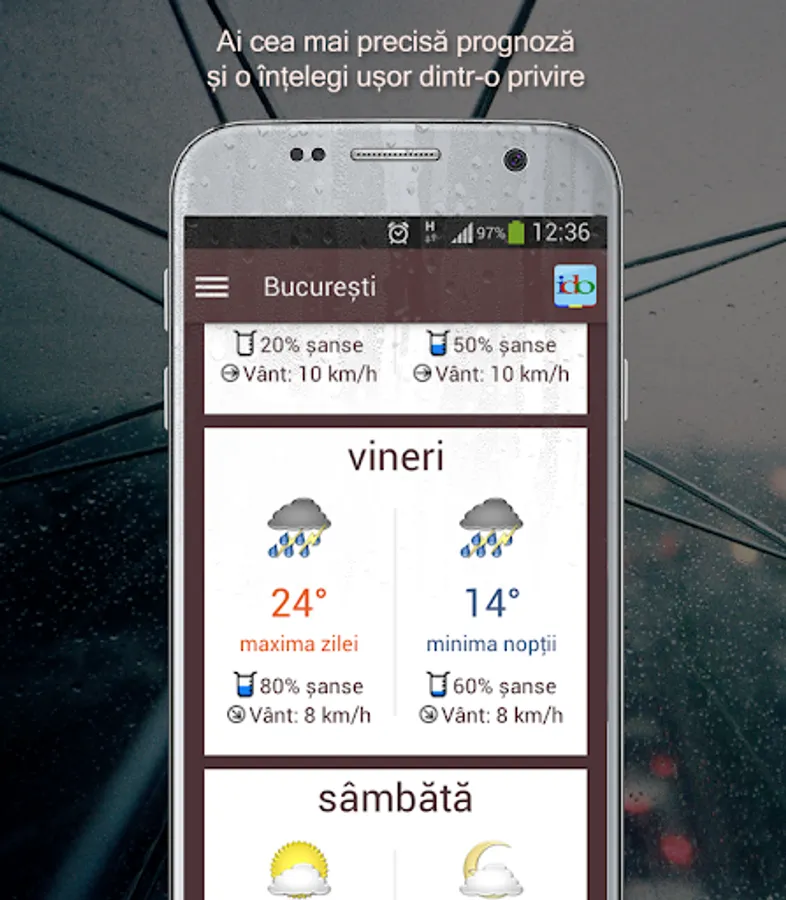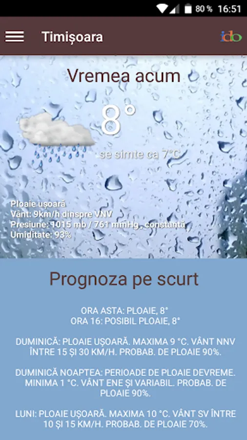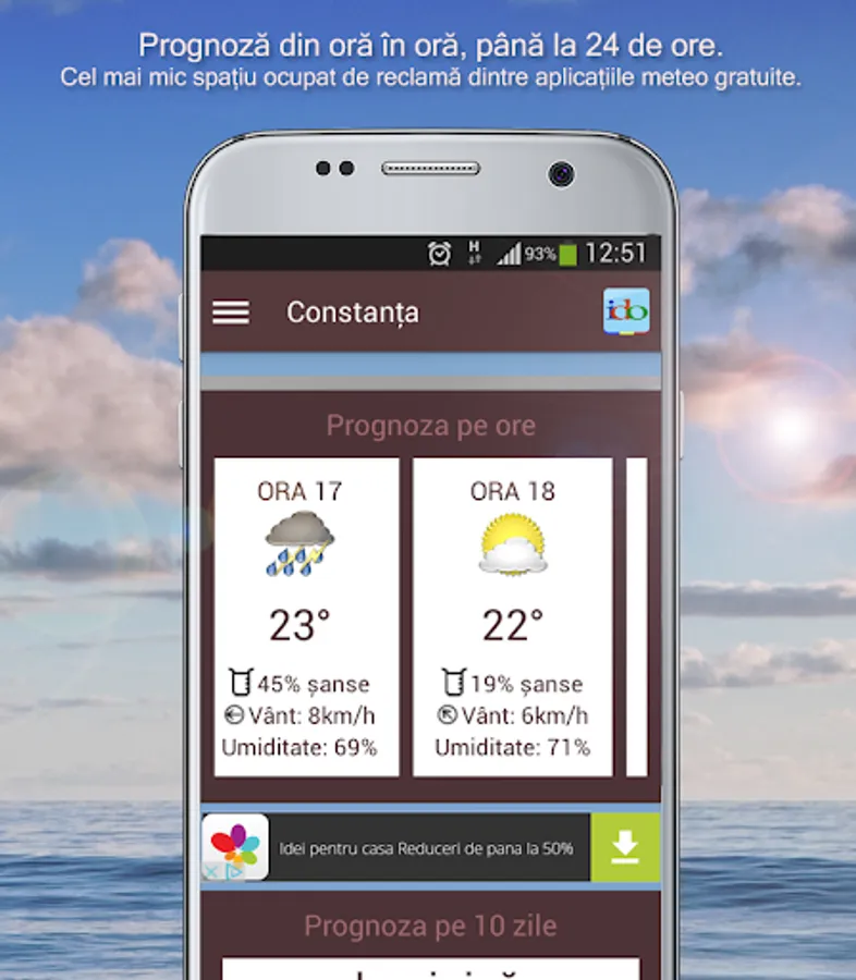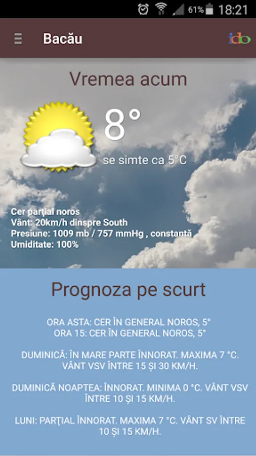 Weather forecast from ido.ro™, now on your Android phone! Get the latest weather info as provided by local meteorological stations from Romania. Plan your activities with our 10 day forecast, precipitation maps and weather news from www.vremea.ro. The app has Romanian interface only and offers meteorological forecast for Romanians locations.
