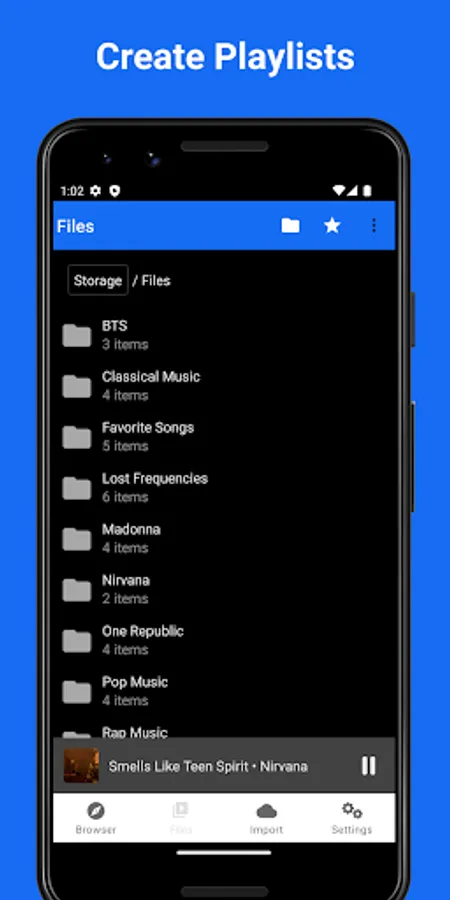 - Create playlists by grouping your audio files into folders.