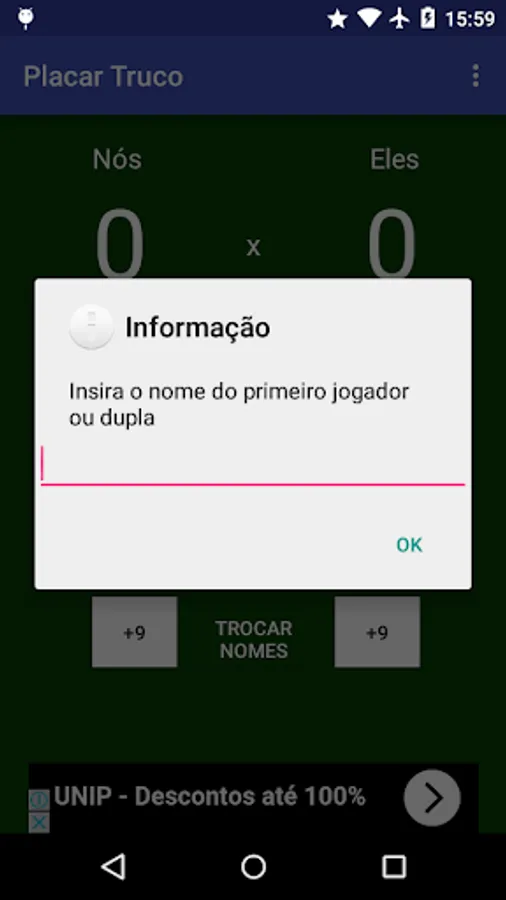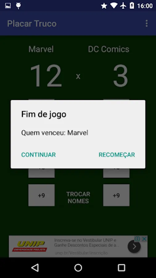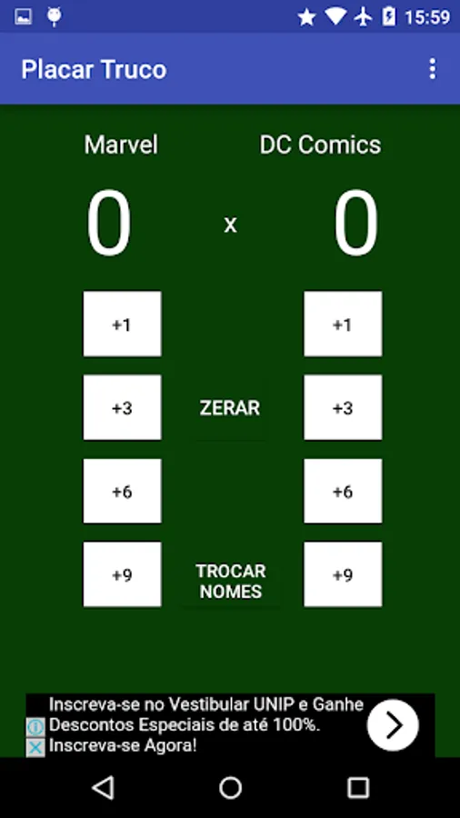 The Truco Score is a way to facilitate the counting of points in the Truco deck game. The application allows entering the names of two players or two pairs and even continuing the game after 12 points.