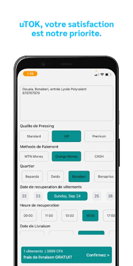 Actuellement disponible uniquement dans la ville de Douala, au Cameroun, uTOK vous permet de profiter d'une solution de blanchisserie pratique, fiable et abordable. Nous nous efforçons de vous offrir un service de qualité exceptionnelle, en respectant les délais convenus et en vous garantissant une satisfaction totale.