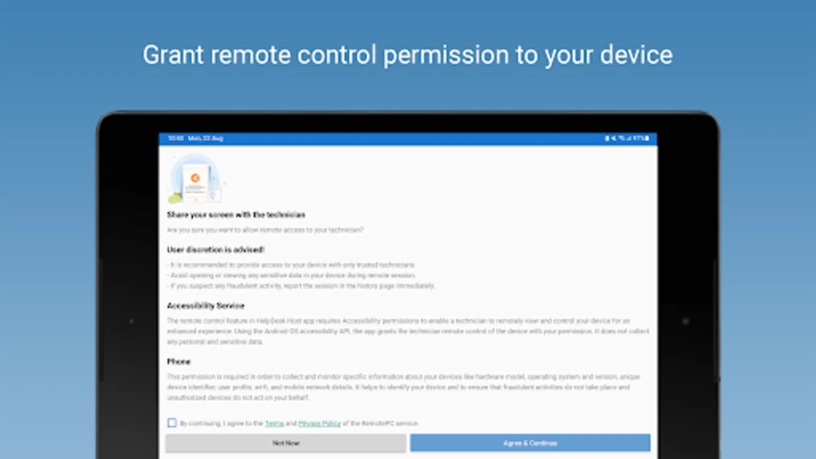 Using the Android OS accessibility API, the app grants the technician remote control access of the device with your permission. It does not collect any personal and sensitive data.