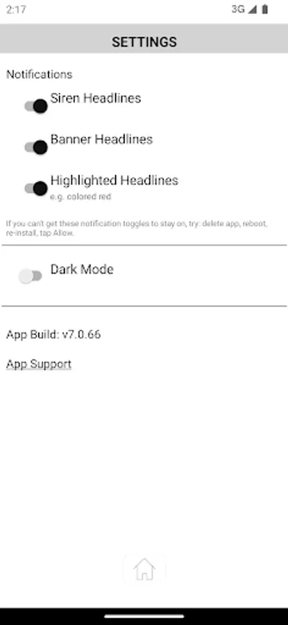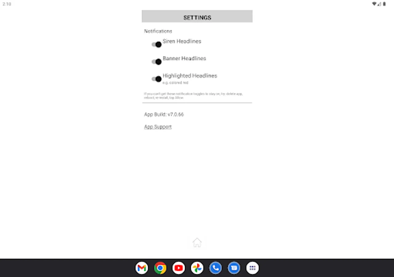 On first open, Android will ask you to allow notifications. Tapping allows results in alerts being sent to your phone whenever there is a siren, new banner or a highlighted headline (e.g. colored red.)