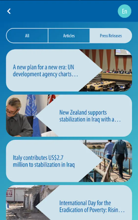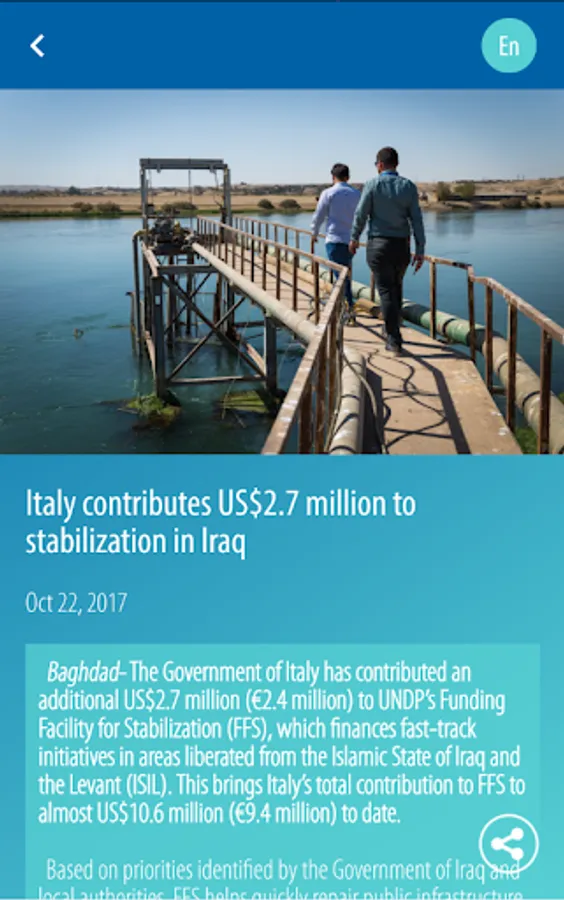 This application keeps users updated about the United Nations Development Programme’s (UNDP) work in Iraq. Being one of very few UN applications worldwide, it features updates, news, impact stories, publications, photos, videos and visualized data on our four areas of work in Iraq: Poverty reduction, democratic governance, crisis prevention and recovery, and stabilization.