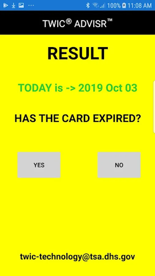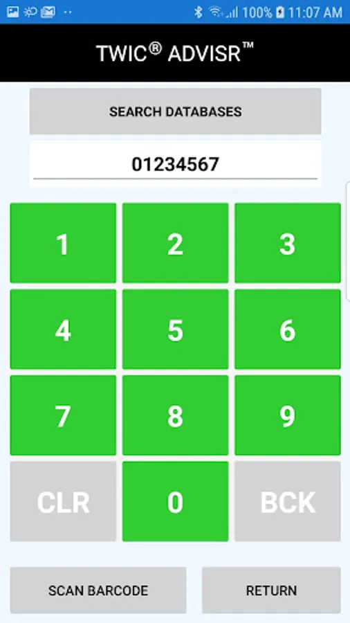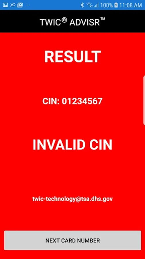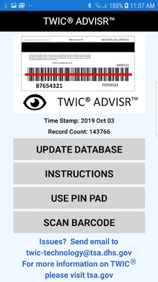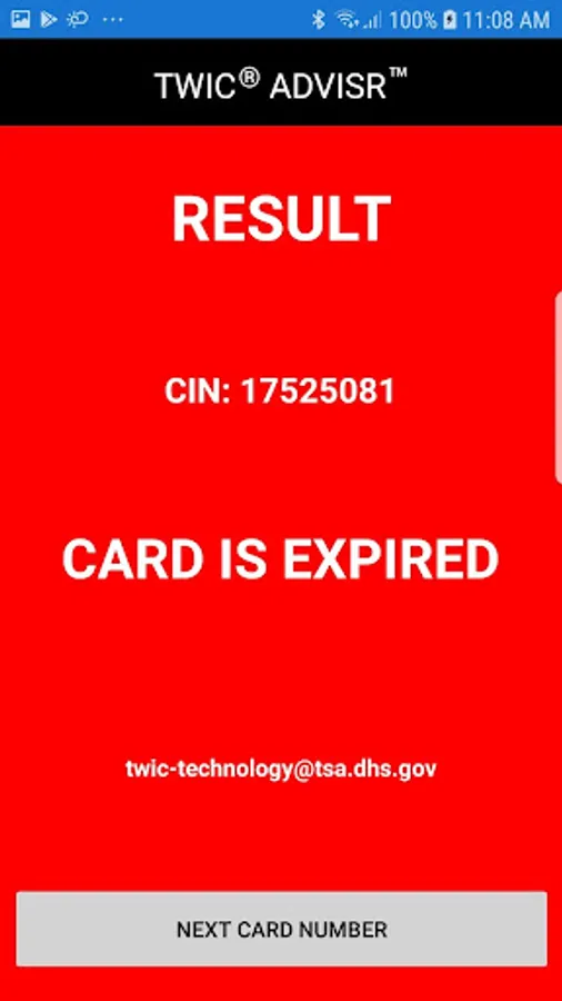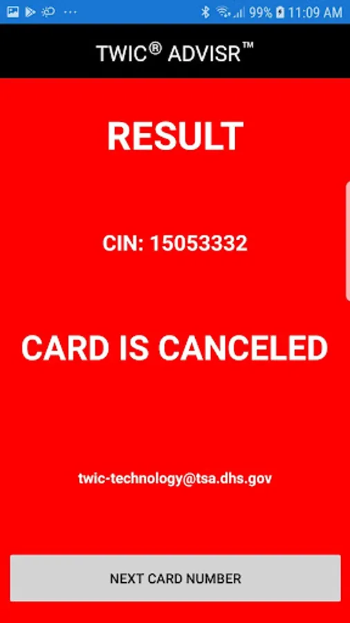 Uses the Credential Identification Number (CIN) printed on the back of the TWIC card and compares it against a List of Canceled CIN Numbers (LCCN) to determine if the card has been canceled. The CIN can be entered via a keypad or the barcode can be scanned via the device's camera. If the CIN is found on the list, the display indicates the card is canceled. If the CIN is not on the list, the operator is prompted to check the expiration date printed on the front of the card. If the card is expired, the display indicates to the operator that it is expired. If it has not expired, the display indicates that the card has not been canceled.