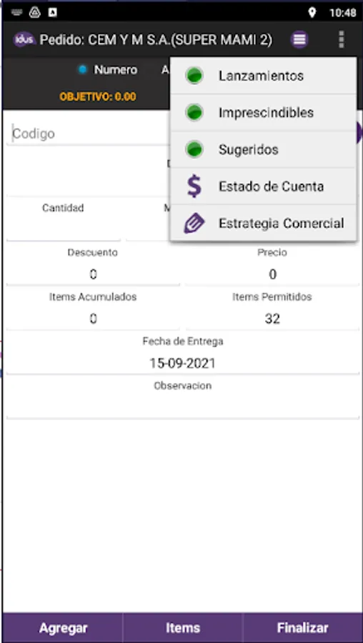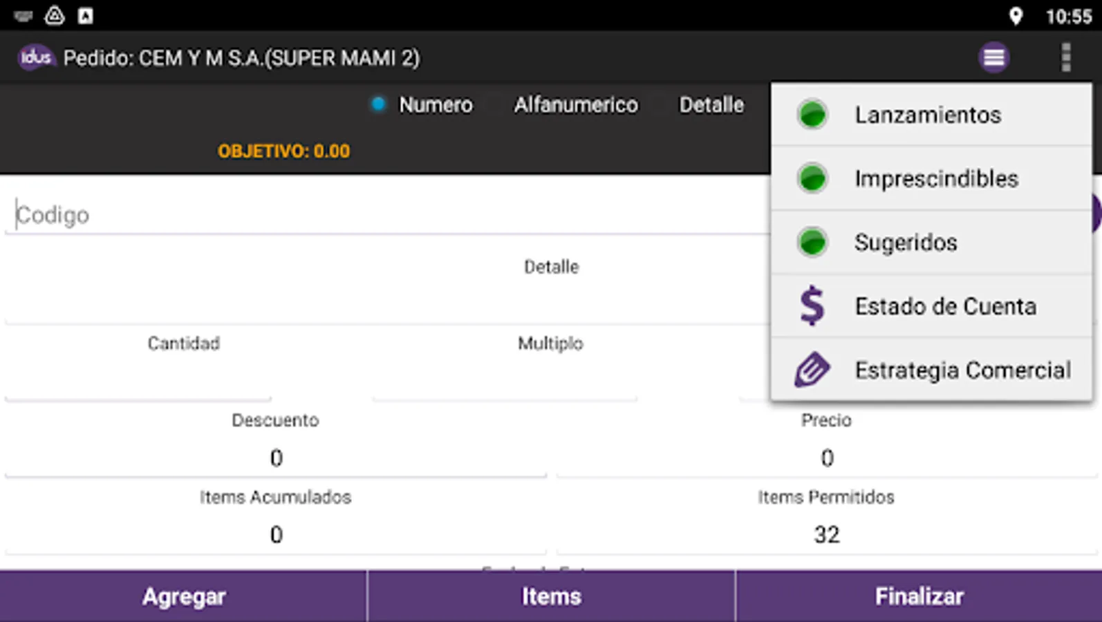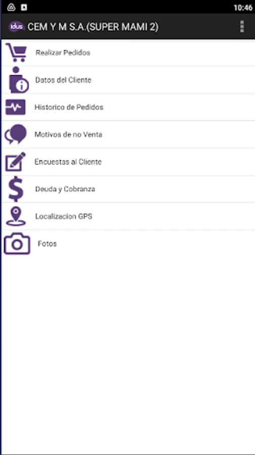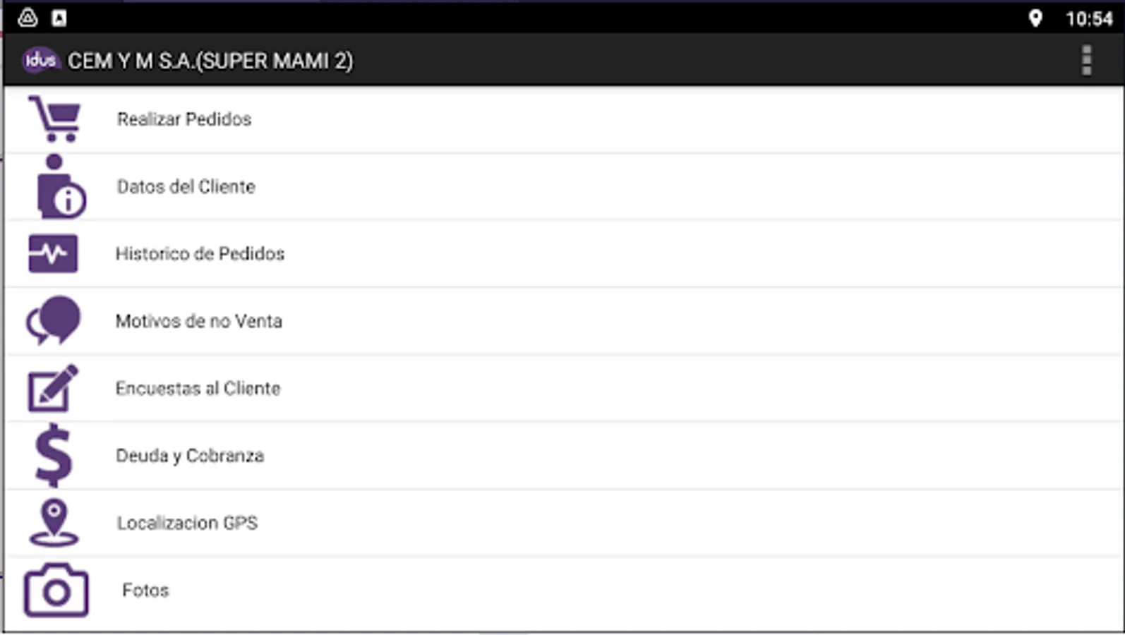 App for taking orders for Idus® sellers, in which you can see the entire model of the company applied in the App. With it you can measure the performance, traceability of the seller, also the essential products and the recommended products. Make closings of days and with it it will be possible to establish the customer's GPS point, to set up the traceability of the delivery.
