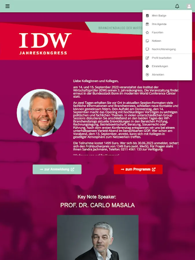 IDW Jahreskongress, Branchentreff der Wirtschaftsprüfer, Networking - Informationen - News aus der Branche. Der Jahreskongress ist ein zentraler Baustein für den Erfahrungsaustausch unter den Mitgliedern. Es erwarten Sie zwei Tage Wissensvermittlung, interessante Vorträge, bereichernde Dialoge mit Kolleginnen und Kollegen und natürlich ein spannender Event-Abend. Wir bieten über 35 verschieden Themen rund um das Thema Wirtschaftsprüfung an. Aktuelles Wissen rund um die Themen Prüfung, Rechnungslegung, Betriebswirtschaft, Beratung, Steuerrecht und Führungskompetenz. In der Fachausstellung informieren wir Sie über neue digitale Lösungen, Publikationen, Versicherungs- und Vorsorgeprodukte sowie Marketinglösungen.