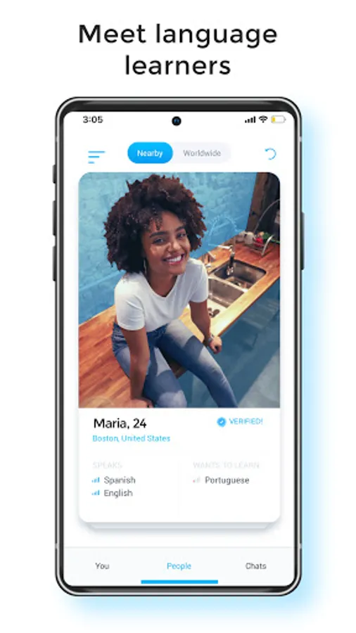 - Connect with language learners nearby, by intuitively swiping through profiles