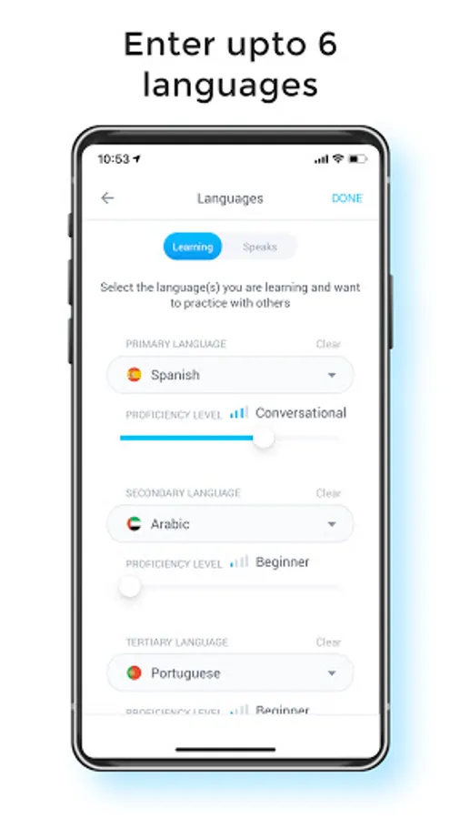 - Select up to 3 language(s) you speak and up to 3 that you are practicing