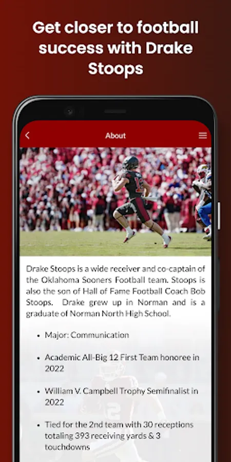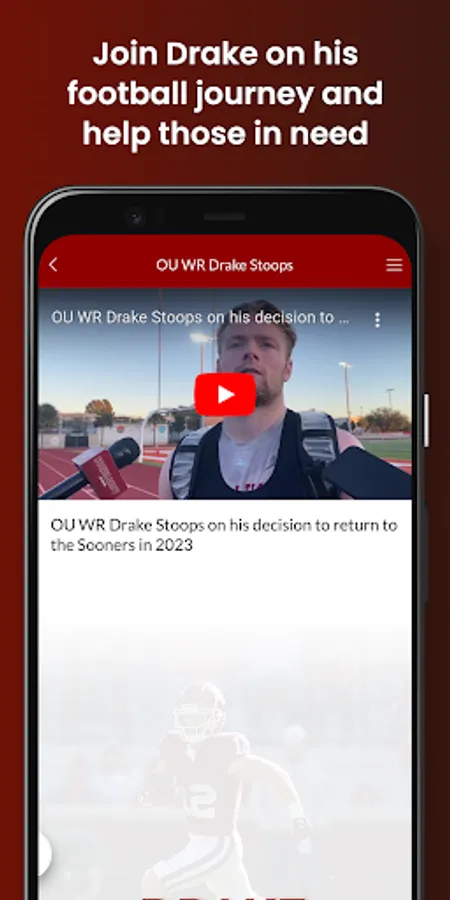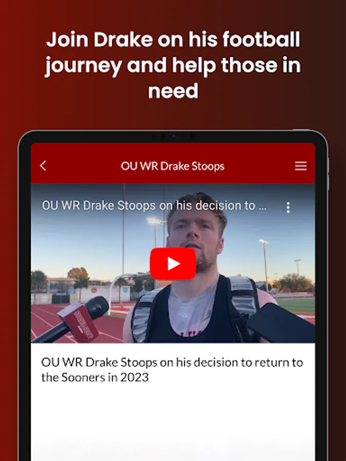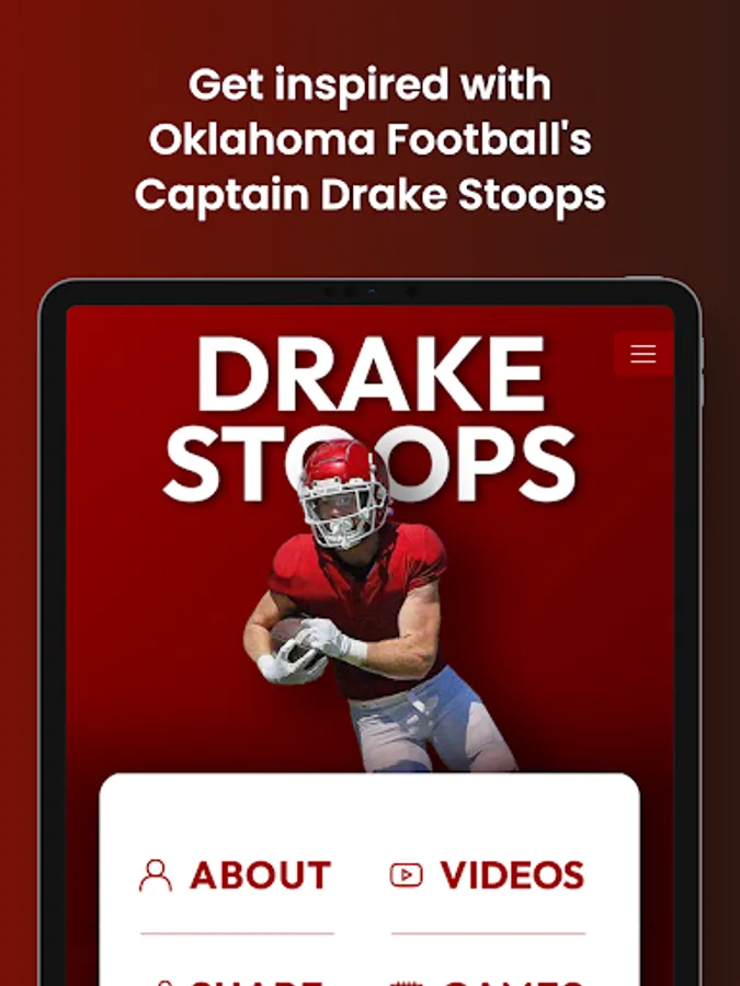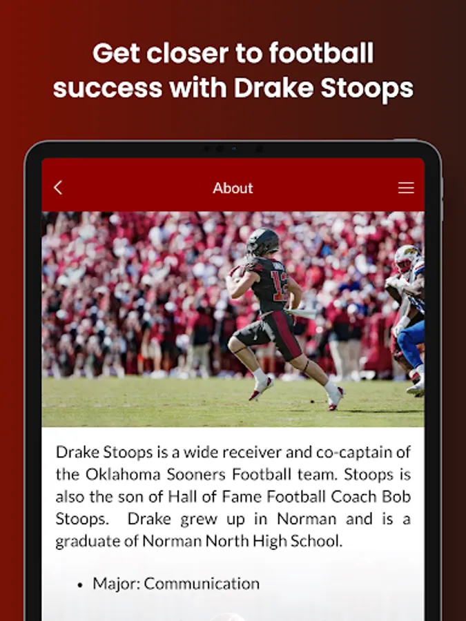 Drake Stoops is a Captain of the Oklahoma Football Team. He's the son of Hall of Fame Football Coach Bob Stoops. Download his app to learn more about Drake, his passion for football and helping others!