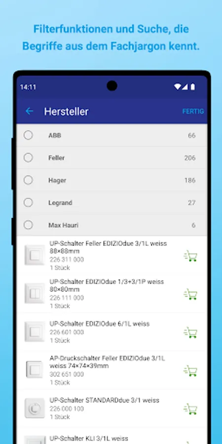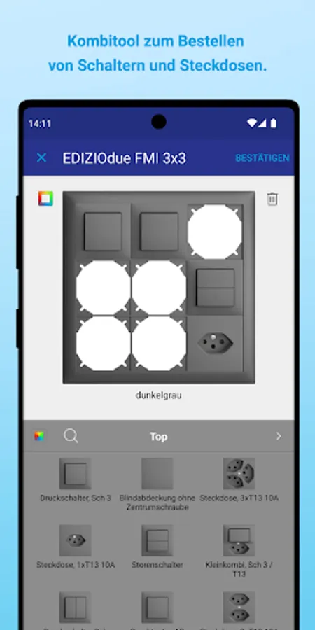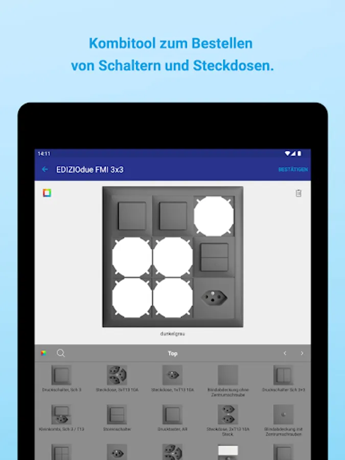 Put together your switch and socket combinations directly on site. The app was designed to make configuring the combinations as intuitive and quick as possible.