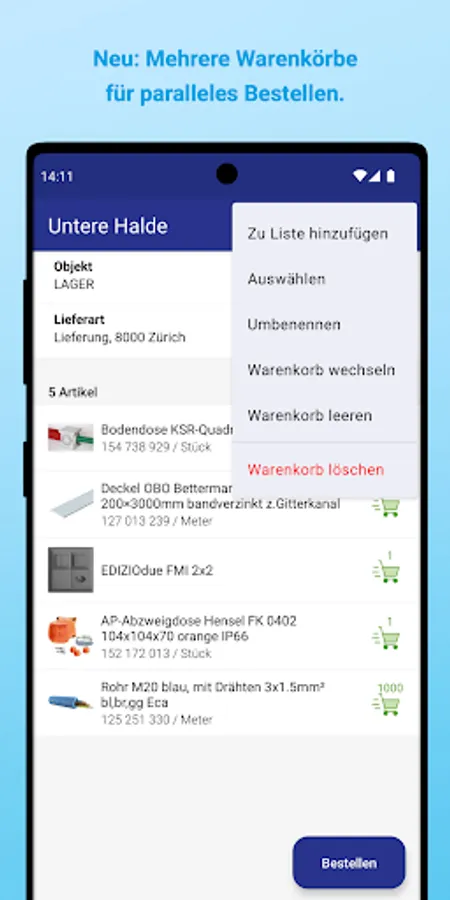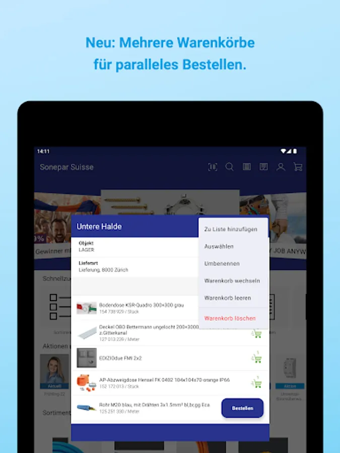 Now the app can be used as a practical order notebook. The items can be recorded in several shopping carts at the same time. The shopping carts always remain synchronized with the web shop and can be ordered separately at any time.
